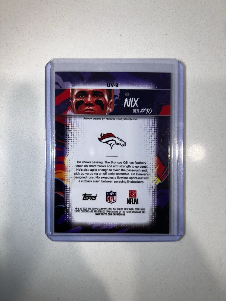 The 2025 Topps Chrome Ultra Violet Bo Nix SSP Case Hit Uv-9 #10 Denver Broncos trading card is a sought-after collectible item in the sports trading card market. This card features Bo Nix, a player from the Denver Broncos in the National Football League (NFL), and is part of the 2025 Topps Chrome set. With a chrome finish and made of card stock, this original card is ungraded and in near mint condition or better. It is a unique addition for collectors looking for a rare and valuable sports trading card.