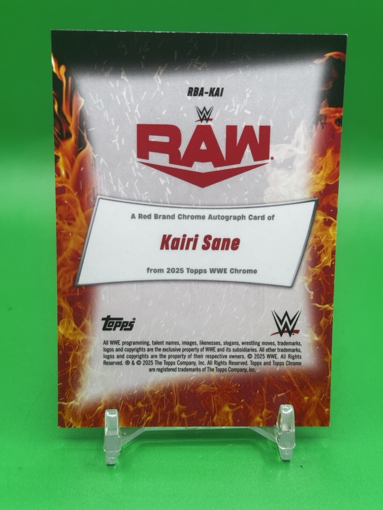 The product is a 2025 Topps Chrome WWE trading card featuring an autograph from wrestler Kairi Sane. This specific card is a parallel variety in Gold, with the autograph being hard-signed directly on the card. It is part of a limited print run of only 50 cards, making it a rare and collectible item for fans of wrestling and trading cards. The card is serial numbered for authenticity and is a sought-after piece in the sports memorabilia market.