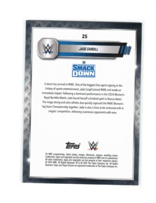 The product is a 2025 Topps Chrome WWE trading card featuring wrestler Jade Cargill. This particular card is a Pink Shimmer Refractor parallel from the base set, with card number 25. Produced by Topps, it is a part of the sports trading card category and specifically falls under the subset of WWE trading cards. Collectors and fans of wrestling and card trading alike may find this limited edition card appealing for its unique design and collectible value. Card will ship in plain white envelope.