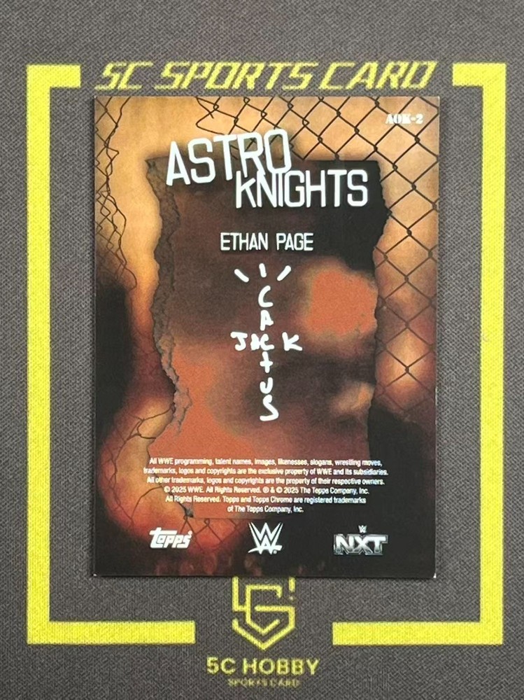The product is a 2025 Topps Chrome WWE X Cactus Jack Astroknights Gold Refractor trading card featuring wrestler Ethan Page. This card is a hard-signed autograph on standard-sized card stock with a thickness of 35 Pt. It is an original release by Topps and is part of the 2025 season. This limited edition card is produced in the United States and is a must-have for wrestling fans and collectors alike.