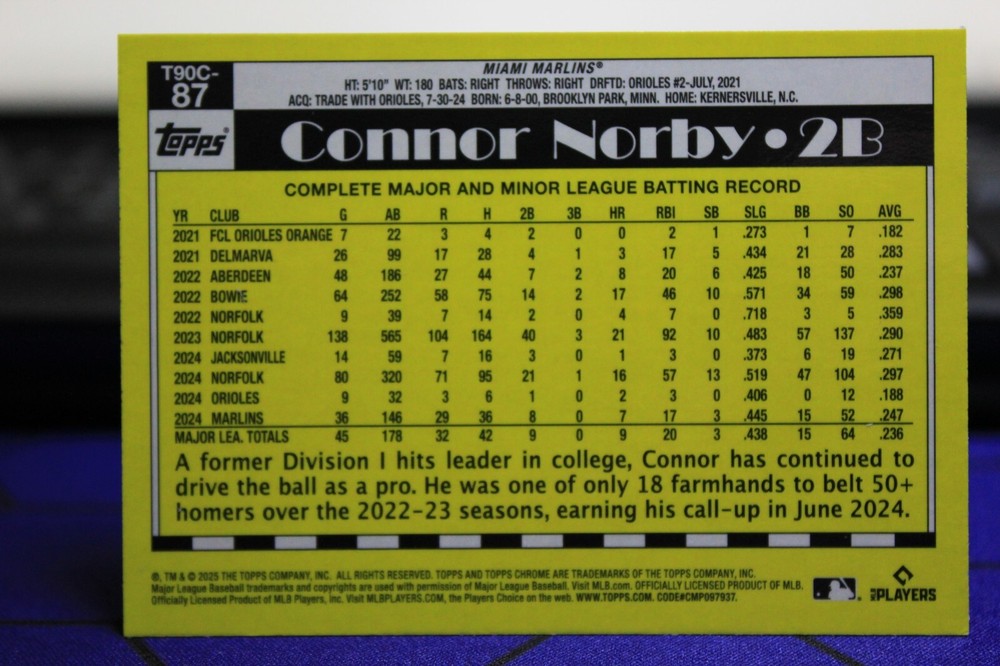 The product is a 2025 Topps Connor Norby Silver Pack Mojofractor trading card featuring the baseball player Connor Norby. This sports trading card is a part of the 2025 Topps set and includes a Mojo Refractor parallel/variety, adding a unique and shiny look to the card. The card is standard-sized and not autographed, making it a desirable item for collectors of baseball cards.