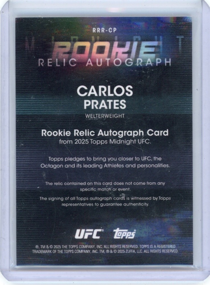 The 2025 Topps Midnight Carlos Prates Rookie Patch Auto #RRR-CP is a highly sought-after sports trading card featuring the rising MMA star Carlos Prates. This card is part of the 2025 Topps set and includes a patch design, making it a unique and collectible item for fans and collectors alike. As a rookie card, it holds special significance for those looking to invest in promising young talent in the world of mixed martial arts. The autograph adds an additional layer of value and authenticity to this exciting sports trading card.