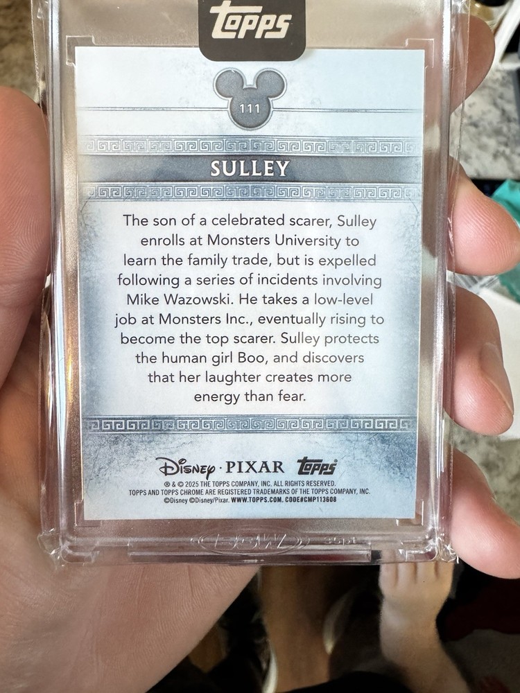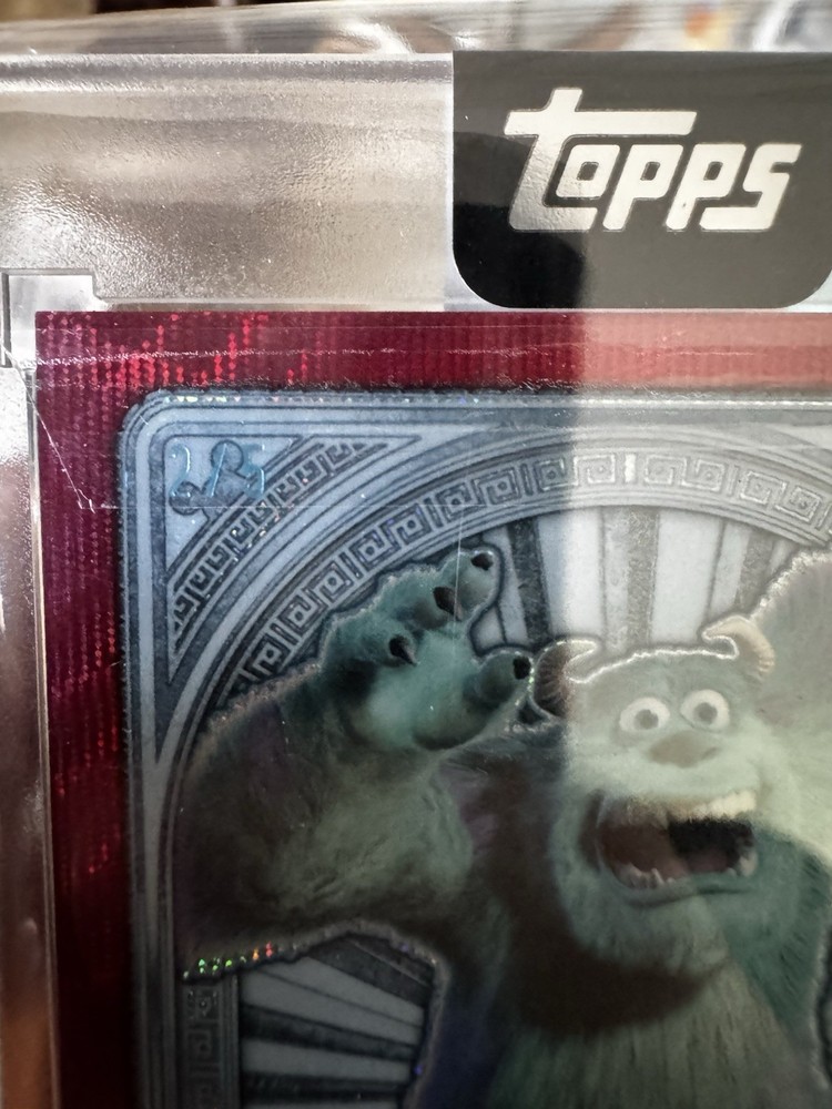 The product is a 2025 Topps Mint Disney Sulley NYCC Red Shimmer Encased trading card featuring the character Sulley from Monsters, Inc. This limited edition card is part of the 2025 Topps Mint NYCC set and is made of card stock with a Red Refractor parallel variety. The card is in near mint or better condition and is an original licensed reprint from Topps, a well-known manufacturer of non-sport trading cards. This collectible item appeals to fans of Disney and TV & movie genres, showcasing a unique design that will surely appeal to enthusiasts of all ages.