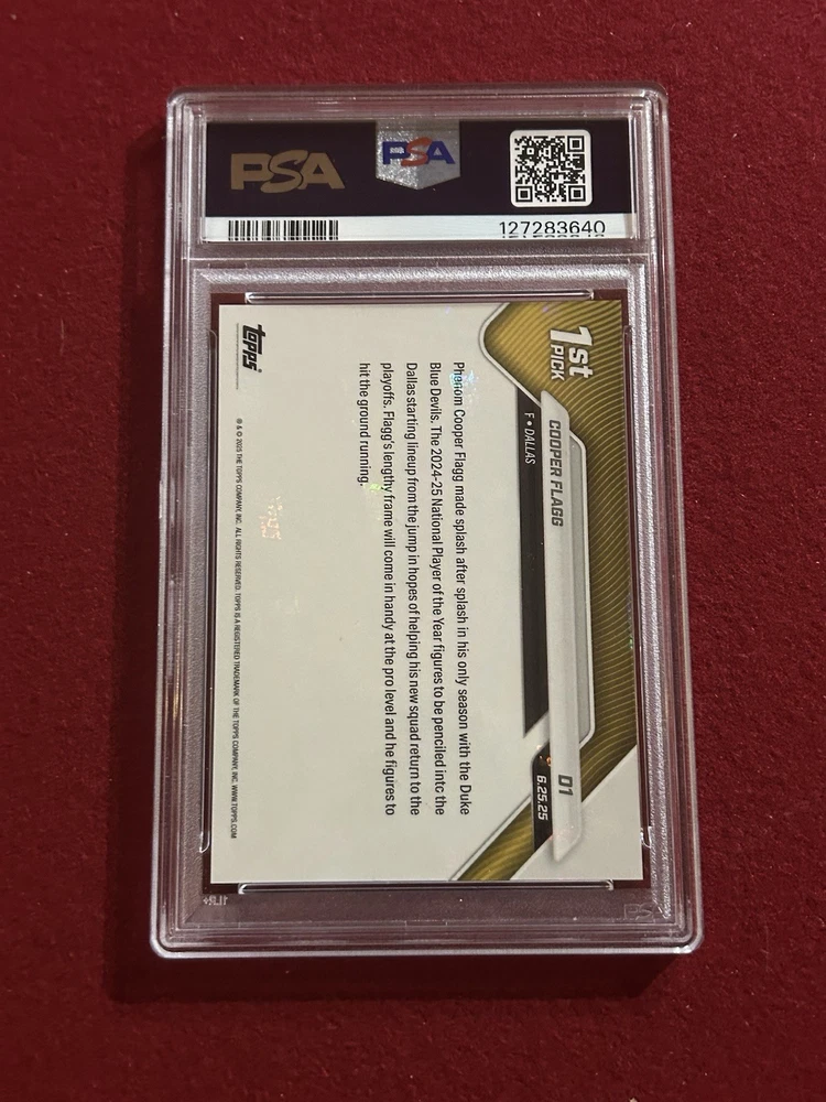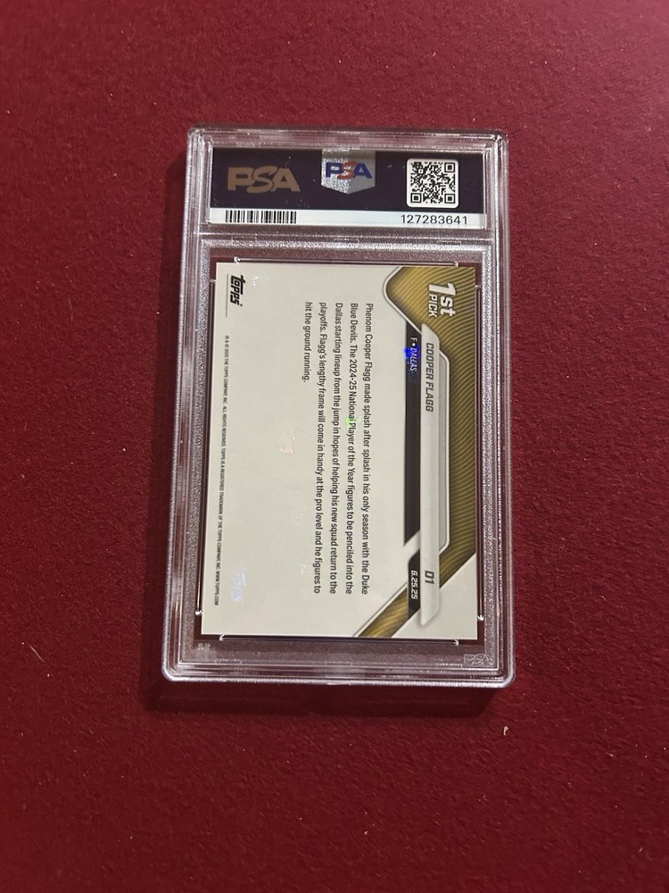 The product is a 2025 Topps Now Draft Cooper Flagg #D1 RC Rookie PSA 9 MINT trading card featuring the player from the Dallas Mavericks. This standard-sized card is made of card stock with a 20 Pt. thickness and is an original piece licensed by Topps. It is part of the 2025 Topps Now set and is a valuable addition for basketball card collectors, especially for fans of the NBA and the Dallas Mavericks.