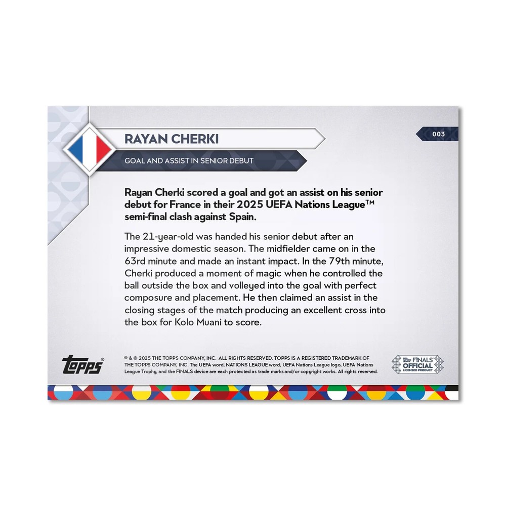 🚨 PRESALE – Will ship once received from Topps (ETA late June) 🚨 This is the official 2025 Topps Now UEFA Nations League card #003 , featuring Rayan Cherki 's senior debut for France β€” with a goal and an assist against Spain in the semi-finals. Card #: 003 Player: Rayan Cherki πŸ‡«πŸ‡· Match: Spain vs France – 06/05/25 Highlight: Goal and Assist in Senior Debut Condition: NM/Mint – Will ship pack fresh Official Topps UEFA Nations League Release – Debut Insert At just 21, Cherki came off the bench to score a stunning volley and provide a late assist for Kolo Muani, instantly announcing himself on the international stage. πŸ“¦ Expected shipping: 2–3 weeks after Topps ships to sellers