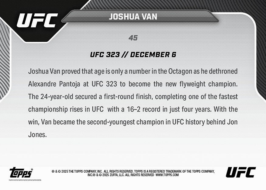 2025 Topps Now UFC #45 Joshua Van UFC 323 RC PRESALE THIS IS A PRESALE. EXPECTED SHIP DATE IS JANUARY 10, 2026. THIS INCLUDES TIME FOR PANINI TO PRINT AND SHIP CARDS TO ME. CARD IS SHIPPED DAY AFTER ARRIVAL. EVERY CARD SHIPPED IN INDIVIDUAL PENNY SLEEVE AND TOP LOADER. TEAM BAGS WILL BE USED.. PLAIN WHITE ENVELOPE SHIPMENTS INCLUDE THIN CARDBOARD AND PAPER FOR ADDED PROTECTION. ANY QUESTIONS, PLEASE ASK!!!