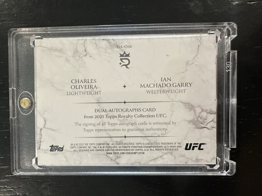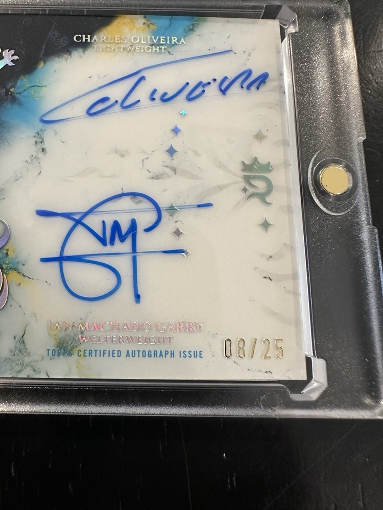 The product is a highly coveted sports trading card featuring notable MMA athletes Charles Oliveira, Ian Machado, and Garry. This rare card is a dual auto with only 25 copies produced, making it a valuable collectible for fans of the sport. With the athletes involved and the limited availability, this card is sure to be a prized possession for any MMA trading card collector.
