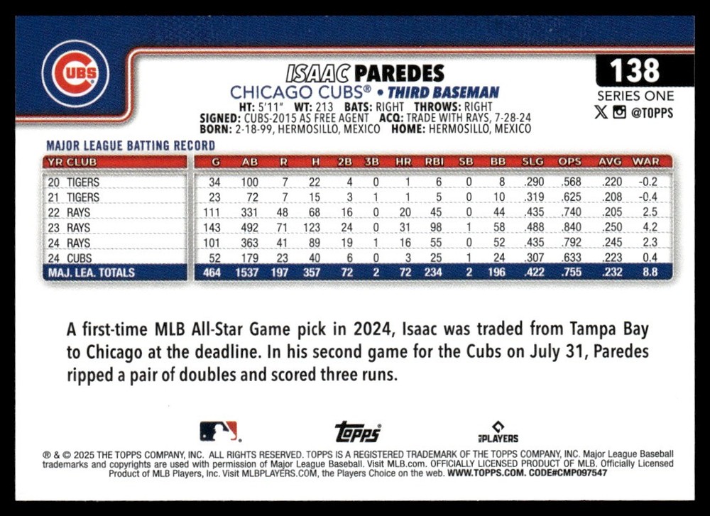About Me Other Listings Feedback Add to Favorites Contact Me eBay Store DJ Chino Sports 2025 Topps Series 1 Base Isaac Paredes Chicago Cubs #138 No stock photo / These are real scans or pictures Details Description: Isaac Paredes Category: Baseball Year: 2025 Product: Topps Series 1 Set: Base Team: Chicago Cubs Card Number: 138 Dimensions: 3½" x 2½" SKU: BL A0000 R01 A (23) Payment Payment due upon purchase. Shipping Shipping - Please see shipping for pricing and details. - Every card (excluding graded cards) will be shipped in a penny sleeve and Card Saver. Some cases in a top loader. - Any damage to your card during shipping, or not received. I will contact eBay to issue a refund. - I honor combined shipping and discounted shipping for additional items. For standard cards, $.10 each for additional cards. For more information, please check shipping details. - For Graded Cards, I will be shipping in a standard box and well protected. Rookie No returns or cancellations accepted. About Us Welcome to my store. I have been collecting cards for 30+ years and enjoy collecting. I am starting my store so that I can share my collection to the world. Please check out my other listings and feel free to reach out to me with any questions. Thank you. Cards Information - Cards are scanned and immediately after break. - Please refer to photos for additional details. - Cards are in NMINT or better shape may have lines, smudges, different color, or dust due to the scanner. If you would like more details on this card. Please message me and will be happy to send other photos. - Cards may have minor flaws such as slight corner/edge dings, production printing, surface dimples, ect. Please message me if you have questions. - All my cards are stored in a cool environment and in card boxes. - With listings that have multiple quantities. I do label condition, and may not be the card you you see in the picture. If you would like additional photos, please let me know and will eBay message you photos. Listing By Kronocard trading cards software v2.8.2.3