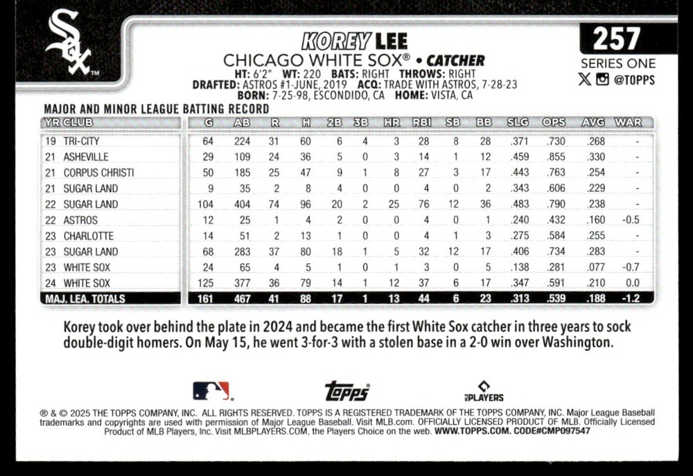 About Me Other Listings Feedback Add to Favorites Contact Me eBay Store DJ Chino Sports 2025 Topps Series 1 Base Korey Lee Chicago White Sox #257 No stock photo / These are real scans or pictures Details Description: Korey Lee Category: Baseball Year: 2025 Product: Topps Series 1 Set: Base Team: Chicago White Sox Card Number: 257 Dimensions: 3½" x 2½" SKU: BL A0000 R01 A (121) Payment Payment due upon purchase. Shipping Shipping - Please see shipping for pricing and details. - Every card (excluding graded cards) will be shipped in a penny sleeve and Card Saver. Some cases in a top loader. - Any damage to your card during shipping, or not received. I will contact eBay to issue a refund. - I honor combined shipping and discounted shipping for additional items. For standard cards, $.10 each for additional cards. For more information, please check shipping details. - For Graded Cards, I will be shipping in a standard box and well protected. Rookie No returns or cancellations accepted. About Us Welcome to my store. I have been collecting cards for 30+ years and enjoy collecting. I am starting my store so that I can share my collection to the world. Please check out my other listings and feel free to reach out to me with any questions. Thank you. Cards Information - Cards are scanned and immediately after break. - Please refer to photos for additional details. - Cards are in NMINT or better shape may have lines, smudges, different color, or dust due to the scanner. If you would like more details on this card. Please message me and will be happy to send other photos. - Cards may have minor flaws such as slight corner/edge dings, production printing, surface dimples, ect. Please message me if you have questions. - All my cards are stored in a cool environment and in card boxes. - With listings that have multiple quantities. I do label condition, and may not be the card you you see in the picture. If you would like additional photos, please let me know and will eBay message you photos. Listing By Kronocard trading cards software v2.8.2.3