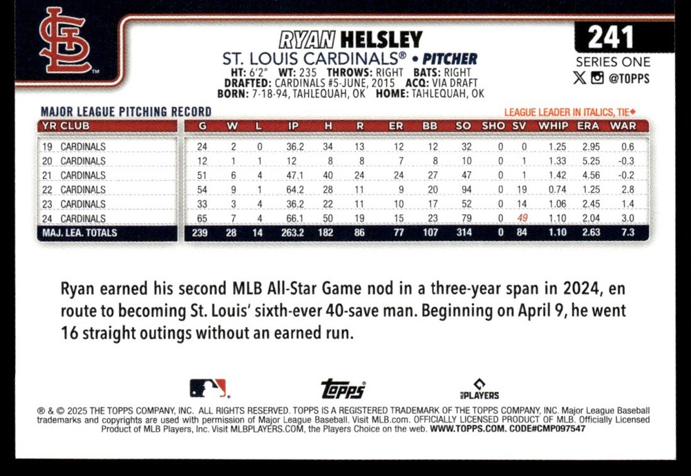 About Me Other Listings Feedback Add to Favorites Contact Me eBay Store DJ Chino Sports 2025 Topps Series 1 Base Ryan Helsley St. Louis Cardinals #241 No stock photo / These are real scans or pictures Details Description: Ryan Helsley Category: Baseball Year: 2025 Product: Topps Series 1 Set: Base Team: St. Louis Cardinals Card Number: 241 Dimensions: 3½" x 2½" SKU: BL A0000 R01 A (141) Payment Payment due upon purchase. Shipping Shipping - Please see shipping for pricing and details. - Every card (excluding graded cards) will be shipped in a penny sleeve and Card Saver. Some cases in a top loader. - Any damage to your card during shipping, or not received. I will contact eBay to issue a refund. - I honor combined shipping and discounted shipping for additional items. For standard cards, $.10 each for additional cards. For more information, please check shipping details. - For Graded Cards, I will be shipping in a standard box and well protected. Rookie No returns or cancellations accepted. About Us Welcome to my store. I have been collecting cards for 30+ years and enjoy collecting. I am starting my store so that I can share my collection to the world. Please check out my other listings and feel free to reach out to me with any questions. Thank you. Cards Information - Cards are scanned and immediately after break. - Please refer to photos for additional details. - Cards are in NMINT or better shape may have lines, smudges, different color, or dust due to the scanner. If you would like more details on this card. Please message me and will be happy to send other photos. - Cards may have minor flaws such as slight corner/edge dings, production printing, surface dimples, ect. Please message me if you have questions. - All my cards are stored in a cool environment and in card boxes. - With listings that have multiple quantities. I do label condition, and may not be the card you you see in the picture. If you would like additional photos, please let me know and will eBay message you photos. Listing By Kronocard trading cards software v2.8.2.3