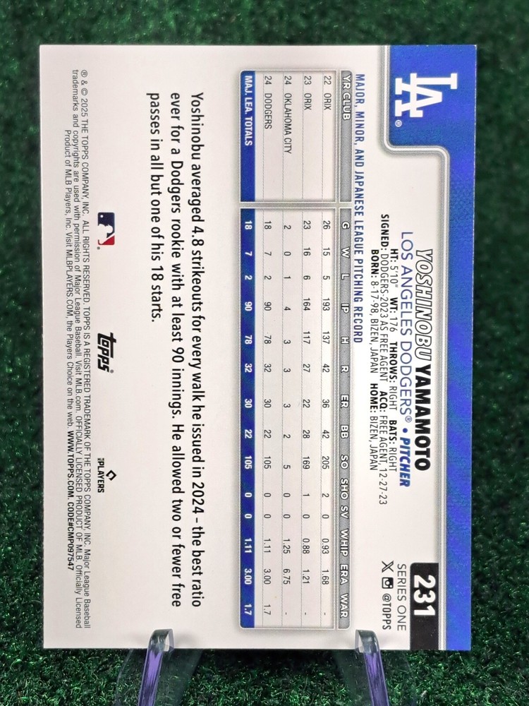 Capture a slice of baseball history with the 2025 Topps Series 1 #231 card featuring the promising talent, Yoshinobu Yamamoto, of the Los Angeles Dodgers. This card celebrates the athlete's potential as a Future Star, making it a must-have for collectors and fans alike. The vibrant design, coupled with the prestige of the Major League Baseball, ensures this card stands out in any collection. Crafted by Topps, a trusted name in sports memorabilia, this trading card is part of the highly sought-after 2025 Topps set. Whether you're a dedicated follower of the Dodgers or an enthusiast of the sport, this card is a tangible representation of the player's journey and the MLB's enduring legacy.