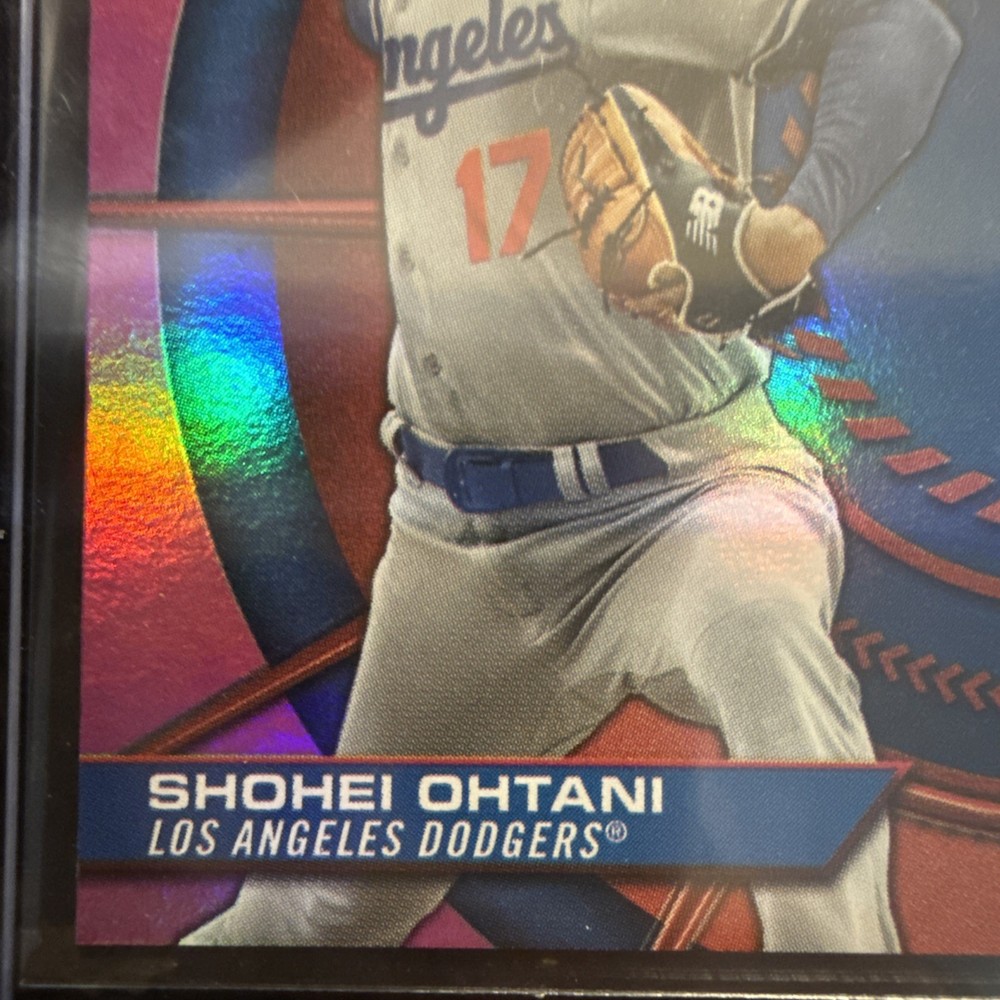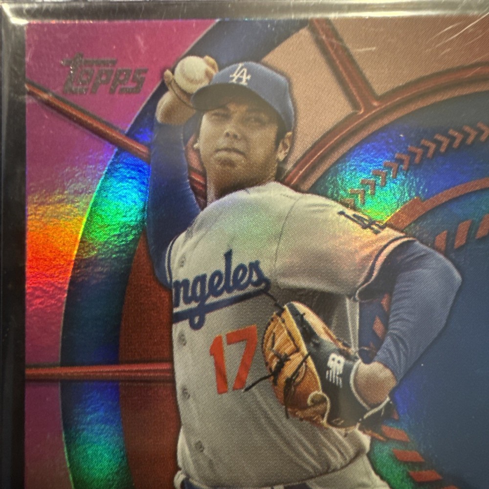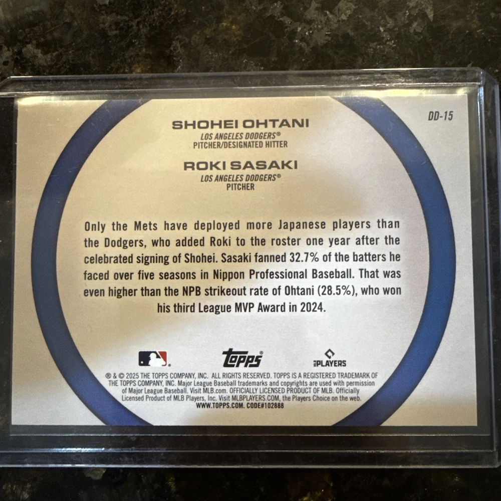 The product is a 2025 Topps Series 2 baseball trading card featuring Shohei Ohtani and Roki Sasaki of the Los Angeles Dodgers. This card is a special pink foil parallel, with a 20 pt. thickness and a print run of 99226. It is manufactured by Topps, authenticated by Topps, and is an original piece made of card stock. The card is in English and belongs to the Major League Baseball World Series set.