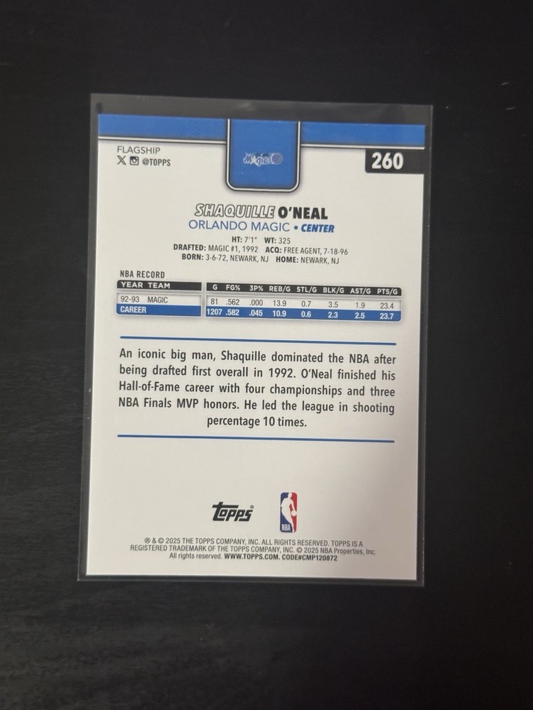 The 2025 Topps Shaquille O'Neal 260 Gold Border trading card is a rare and collectible item featuring the legendary basketball player from the Orlando Magic. This limited edition card is part of the 2025 Topps set and is printed on high-quality card stock with a 20 Pt. thickness. The gold border adds a unique touch to this sought-after piece, making it a standout addition to any sports memorabilia collection. With an original print run of 2025, this Topps card is sure to appeal to fans and collectors alike for years to come.