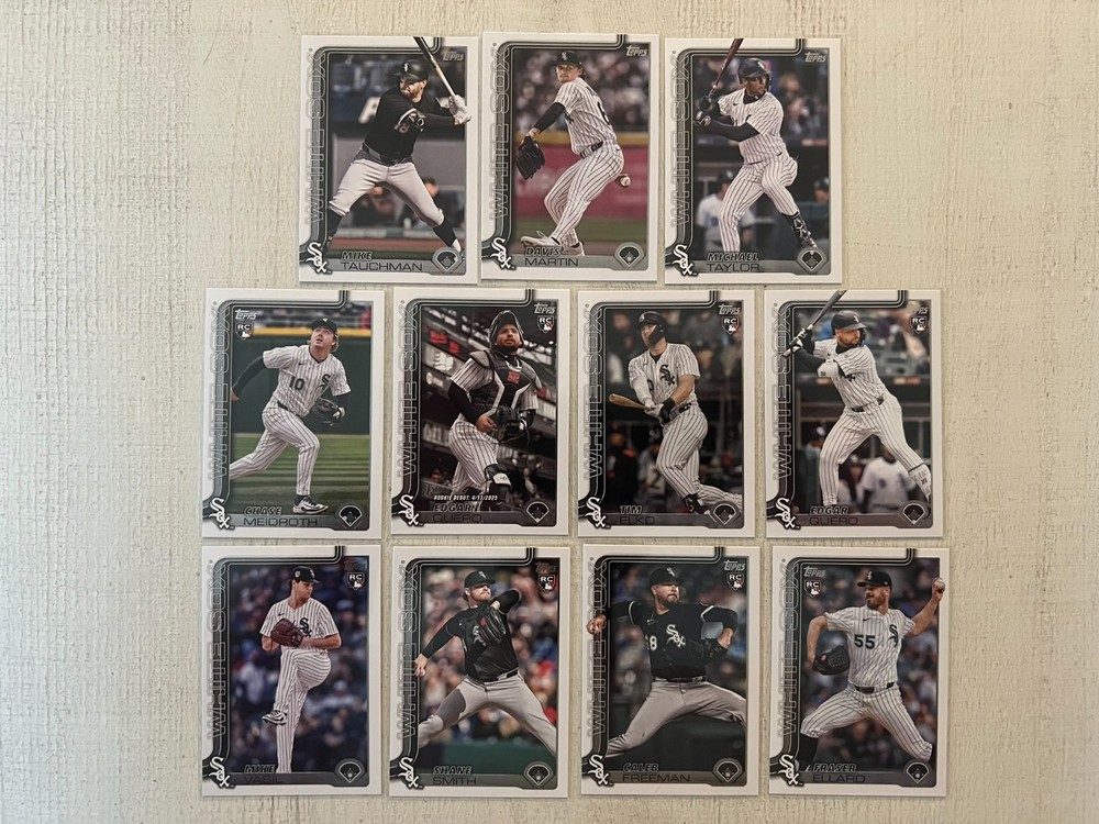 2025 Topps Update FULL Team Sets - You Pick These are FULL team sets of base cards for 2025 Topps Update Release. See the breakdown of each team set below. 2025 Topps Update is currently scheduled to release on November 12th. I expect to start shipping orders within 1 week of release. Shipping will be eBay Standard Envelope. If three or more sets are purchased, will ship in a bubble mailer. Please reach out if any questions! Team Set Breakdown Angels US15 Kyren Paris US17 Garrett McDaniels RC US24 Yoán Moncada US33 Travis d'Arnaud US121 Ryan Johnson RC US136 Kyle Hendricks US187 Caden Dana (Rookie Debut) US314 Matthew Lugo RC US319 Michael Darrell-Hicks RC US324 Ryan Zeferjahn RC US338 José Fermin RC US343 Jorge Soler Arizona Diamondbacks US110 Josh Naylor US232 Juan Morillo RC US267 Adrian Del Castillo (Rookie Debut) US272 Jose Herrera US287 Tim Tawa RC Athletics US14 Denzel Clarke RC US20 Mitch Spence US23 Gio Urshela US61 Elvis Alvarado RC US79 Willie MacIver RC US80 Lawrence Butler (Veteran Combos) US80 Brent Rooker (Veteran Combos) US95 Michel Otañez RC US104 Carlos Duran RC US143 CJ Alexander RC US180 Jacob Wilson (Rookie Debut) US197 Nick Kurtz (Rookie Debut) US201 Nick Kurtz RC US213 Logan Davidson RC US250 Max Muncy RC US252 Justin Sterner RC US254 Gunnar Hoglund RC US283 Jeffrey Springs US330 Austin Wynns US334 Luis Urías Atlanta Braves US4 Alex Verdugo US87 Drake Baldwin RC US106 Nick Allen US113 Drake Baldwin (Rookie Debut) US189 Eli White US216 Nathan Wiles RC US229 Marcell Ozuna (Veteran Combos) US229 Ozzie Albies (Veteran Combos) US296 Parker Dunshee RC US327 Spencer Schwellenbach (Rookie Debut) Baltimore Orioles US55 Tomoyuki Sugano (Rookie Debut) US97 Brandon Young RC US114 Grant Wolfram RC US146 Kade Strowd RC US171 Ramón Laureano US181 Dylan Carlson US210 Yaramil Hiraldo RC US242 Charlie Morton US274 Maverick Handley RC US282 Coby Mayo (Rookie Debut) Boston Red Sox US1 Kristian Campbell RC US36 Luis Guerrero RC US103 Walker Buehler US105 Marcelo Mayer RC US112 Romy Gonzalez US116 Aroldis Chapman US129 Kristian Campbell (Rookie Debut) US241 Marcelo Mayer (Veteran Combos) US241 Kristian Campbell (Veteran Combos) US257 Hunter Dobbins RC US276 Marcelo Mayer (Rookie Debut) Chicago Cubs US27 Justin Turner US46 Ryan Pressly US128 Kevin Alcántara (Rookie Debut) US139 Jon Berti US140 Cade Horton RC US156 Carson Kelly US164 Pete Crow-Armstrong (Season Highlights/Checklist) US200 Matt Shaw RC US214 Cade Horton (Rookie Debut) US236 Moisés Ballesteros (Rookie Debut) US248 Justin Steele US262 Moisés Ballesteros RC US309 Dansby Swanson (Veteran Combos) US309 Matt Shaw (Veteran Combos) US335 Colin Rea US345 Matt Shaw (Rookie Debut) Chicago White Sox US43 Mike Tauchman US57 Michael Taylor US145 Edgar Quero RC US159 Fraser Ellard RC US219 Mike Vasil RC US224 Tim Elko RC US253 Caleb Freeman RC US278 Shane Smith RC US294 Davis Martin US325 Edgar Quero (Rookie Debut) US337 Chase Meidroth RC Cincinnati Reds US6 Levi Jordan RC US13 Jose Trevino US58 Connor Joe US102 Luis Mey RC US150 Santiago Espinal US168 Eric Yang RC US235 Elly De La Cruz (Season Highlights/Checklist) US275 Chase Petty RC US280 Evan Kravetz RC US315 Tyler Callihan RC US318 Rhett Lowder (Rookie Debut) US331 Elly De La Cruz (Veteran Combos) US331 Matt McLain (Veteran Combos) US344 Brady Singer Cleveland Guardians US26 José Ramírez (Veteran Combos) US26 Steven Kwan (Veteran Combos) US44 Doug Nikhazy RC US67 Nic Enright RC US142 Johnathan Rodríguez US148 Carlos Santana US206 Gabriel Arias US238 Zak Kent RC US255 Will Wilson RC US284 Erik Sabrowski RC US288 Logan Allen US341 Nolan Jones Colorado Rockies US2 Zac Veen (Rookie Debut) US5 Jeff Criswell RC US8 Tanner Gordon RC US31 Zach Agnos RC US94 Adael Amador (Rookie Debut) US123 Braxton Fulford RC US124 Ryan Rolison RC US151 Chase Dollander RC US154 Antonio Senzatela US215 Jack O'Loughlin RC US246 Mickey Moniak US259 Chase Dollander (Rookie Debut) US285 Juan Mejia RC US286 Zac Veen RC US303 Tyler Freeman US321 Carson Palmquist RC US339 Thairo Estrada Detroit Tigers US42 Manuel Margot US93 Jace Jung (Rookie Debut) US118 Gage Workman RC US162 Bailey Horn RC US167 Chase Lee RC US193 Jackson Jobe (Rookie Debut) US198 Bryan Sammons RC US247 Tyler Owens RC US317 Ryan Miller RC Houston Astros US45 Cam Smith (Rookie Debut) US117 Logan VanWey RC US149 Victor Caratini US157 Colton Gordon RC US177 AJ Blubaugh RC US183 Bryan King RC US195 Isaac Paredes US292 Ryan Gusto RC US298 Cam Smith RC US323 Luis Contreras RC Kansas City Royals US65 Noah Cameron RC US83 Kris Bubic US88 Dairon Blanco US122 Tyler Tolbert RC US134 Noah Murdock RC US175 Jonathan India US176 Evan Sisk RC US192 John Rave RC US209 MJ Melendez (Veteran Combos) US209 Bobby Witt Jr. (Veteran Combos) US222 Michael Lorenzen US237 Carlos Estévez Los Angeles Dodgers US18 Evan Phillips US38 Dalton Rushing RC US70 Dustin May US77 Jack Dreyer RC US84 Shohei Ohtani (Season Highlights/Checklist) US119 Blake Snell (Veteran Combos) US119 Tyler Glasnow (Veteran Combos) US132 Anthony Banda US133 Blake Treinen US166 Miguel Rojas US199 Roki Sasaki (Rookie Debut) US239 Alex Vesia US256 Dalton Rushing (Rookie Debut) US269 Shohei Ohtani (Veteran Combos) US269 Roki Sasaki (Veteran Combos) US312 Hyeseong Kim (Rookie Debut) Miami Marlins US11 Agustín Ramírez RC US49 Michael Petersen RC US52 Liam Hicks RC US53 Luarbert Arias RC US68 Matt Mervis US99 Max Meyer US131 Cade Gibson RC US144 Jonathan Bermúdez RC US158 Lake Bachar RC US188 Graham Pauley US191 Cal Quantrill US211 Patrick Monteverde RC US220 Victor MESA JR. RC US228 Dane Myers US305 Derek Hill US310 Eric Wagaman RC US332 Agustín Ramírez (Rookie Debut) Milwaukee Brewers US30 Eric Haase US59 Caleb Durbin (Rookie Debut) US63 Connor Thomas RC US92 Drew Avans RC US137 Logan Henderson RC US169 Oliver Dunn US170 Caleb Durbin RC US233 Christian Yelich (Veteran Combos) US233 Jackson Chourio (Veteran Combos) US261 Craig Yoho RC US307 Chad Patrick RC US326 James Meeker RC Minnesota Twi