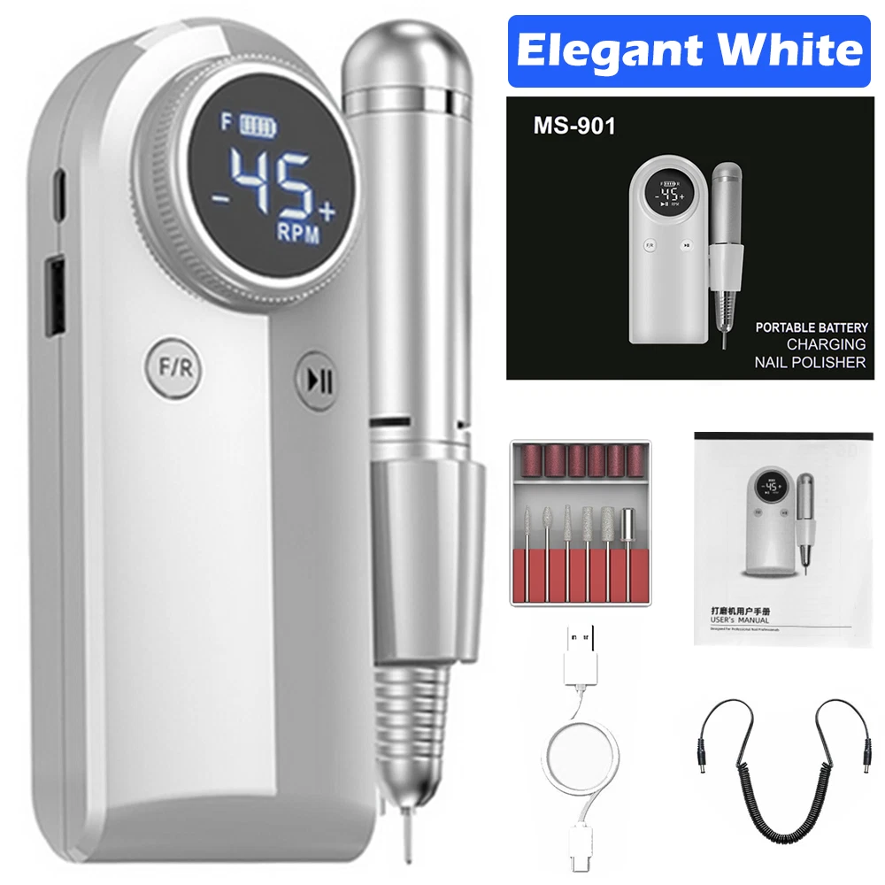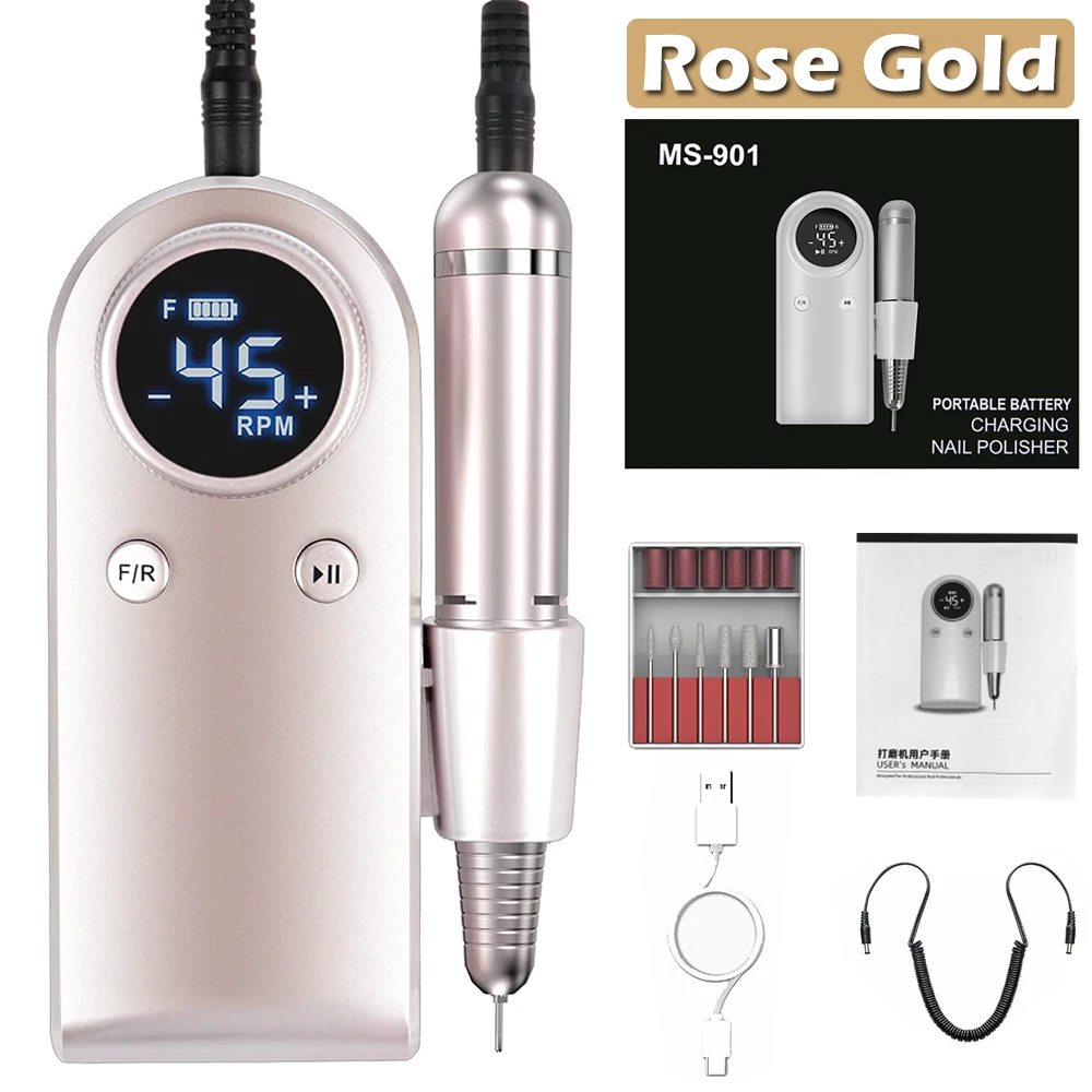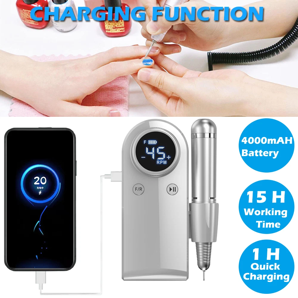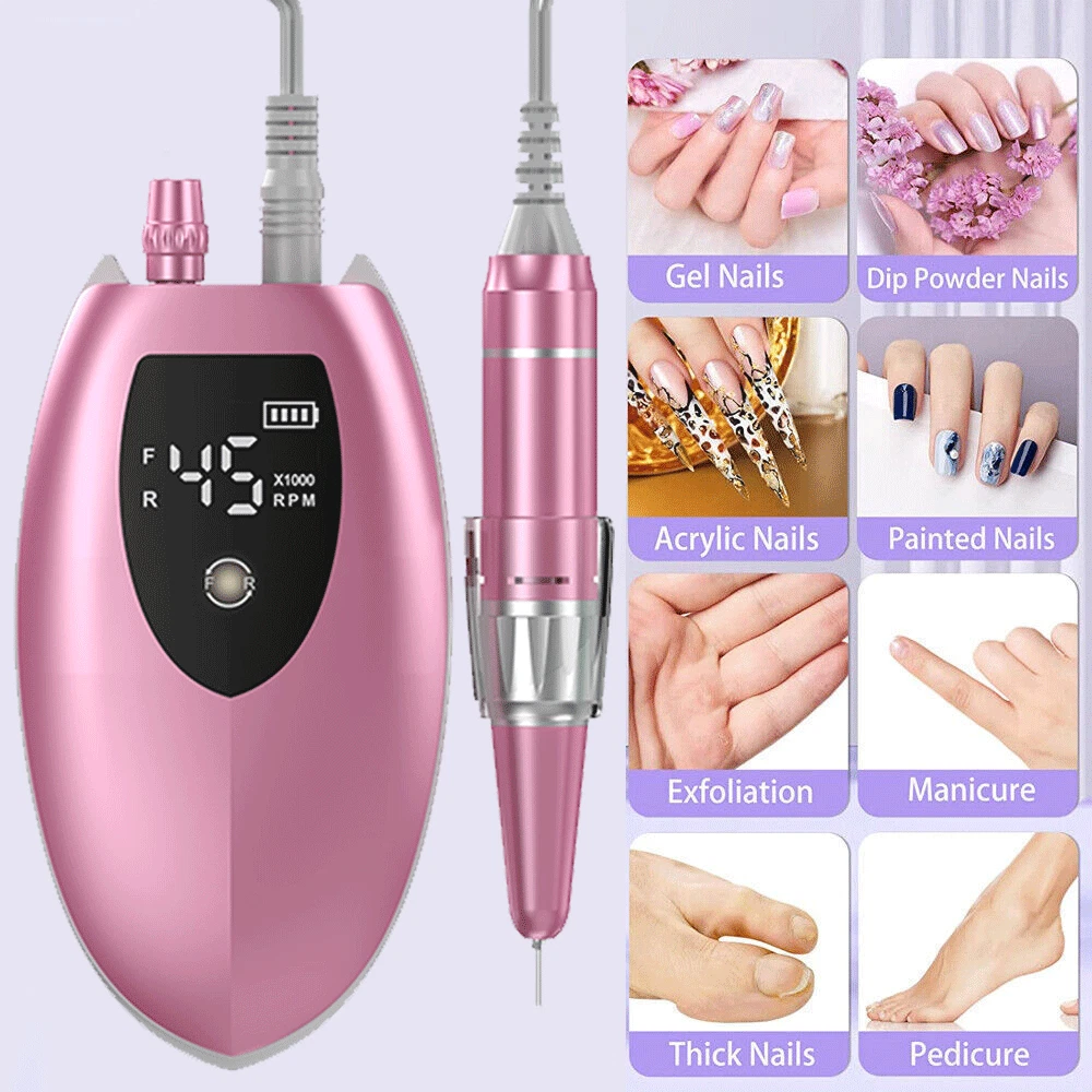 Specifications: ❥Item: Rechargeable 45000 RPM Electric Nail File Nail Gel Polisher Nail Drill Machine ❥Material: Aluminium Alloy+ABS ❥Rechargeable Adaptor Input: 110/220-240V 50~60Hz ❥Speed(RPM): 0~45000RPM ❥Battery Capacity: 4000mA ❥Power: 35W Nail Drill ❥Charging Time: 40 Mins ❥Use Time: 8 H ❥Charging Port: USB Recharge ❥Grinder Type : Suitable for 3/32 "drill bits ❥Grinding Head: 6 types of grinding heads ❥Product Size: 5.6 x 4 x 9.5 Inch( Include Line) ❥Item Weight: Approx 480g Package Includes : 1 x Portable Nail Drill Machine 1 x Handpiece 1 x USB Charger 6 x Drill Bits 6 x Sanding bands 1 x User Manual Feature : ❥❥Powerful and adjustable speed/direction, 6 different metal drill bits, high speed up to 45000 RPM.Low heat, low noise, ultra-low vibration.Powerful smoothing for natural acrylic nails, gel polish dip powder nails, and exfoliation of dead skin and calluses. Professional home and salon use, carving, carving, routing, grinding, sanding, sanding, cutting, polishing, drilling, great for nail polish. ❥❥High-definition LCD display, long battery life & power bank, large-capacity battery with brush less motor, prolonging more use time, this electronic nail machine can last for 8 hours after being fully charged for 40 min . Once charged, you can also use it as a power bank when your phone needs to be turned off. The high-definition LCD display on the rig shows the speed and remaining battery power, which is convenient for you to adjust the speed and reminds you to charge. ❥❥Portable and lightweight design, you can easily take it in your bag. The rig comes with a hook so you can hang it on your clothing, or put it in your pocket or bag. The rig also has a pen holder for easy working in different environments. ❥❥All-aluminum pen, easy to use, high-quality aluminum alloy long-life handle design, matte design can avoid all fingerprints, low noise, low vibration, low temperature operation, safe and reliable.Can be switched left or right, right or left handed. Variable speed control, suitable for different use requirements. Improved wireless smooth operation handle with flexible extension. Rotary lock blocks are used to secure the bit and quickly release the bit. ❥❥The multi-functional manicure drill kit has a wide range of uses, DIY family salon gifts, convenient and elegant gift packaging, and stores various accessories. This is an excellent choice that you must have. Great for holiday gifts. Both professionals and amateurs.