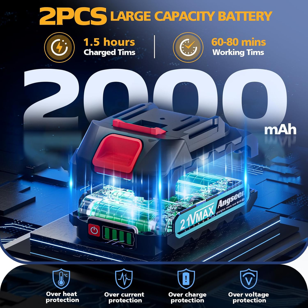 1000W Powerful Brushless Motor: Angseen mini chainsaw is equipped with a 1000W powerful brushless motor, with a cutting speed of up to 42FT/S. It can effortlessly cut through 6-inch wood in just 6 seconds, representing a 30% increase in efficiency compared to traditional pure copper motors with brushes. Additionally, due to the brushless motor’s fewer moving parts and reduced friction, the electric chainsaw cordless operates more stably and safely, without overheating or burning. Its lifespan is also extended by 5 to 7 years compared to pure copper motors Rechargeable Large Capacity Batteries: Angseen mini chain saw battery powered comes with 2x 21V 2000mAh removable & rechargeable lithium batteries, providing a runtime of up to 70 to 90 minutes. This ensures uninterrupted operation and eliminates worries about running out of power. The batteries charge fully in just 1.5 hours, ensuring convenience and speed. For best performance, fully charge the batteries before extended periods of non-use Manganese Steel Chain with Tool-free Adjustment: This mini chainsaw cordless has a high-quality manganese steel chain, deeply quenched for smooth cutting. It easily cuts through thicker wood that other chainsaws struggle with, making it ideal for tree branches, tree trimming, wood cutting, camping, and gardening. Unlike other mini chainsaw that need a screwdriver for adjustment, ours allows tool-free tension changes by turning the knob on the chainsaw, saving you time with quick and easy operation Automatic Oil Filling System: Our small cordless chainsaw features an automatic lubricating chain system. Simply pour regular motor oil into the oil tank and press the bubble hole to lubricate the chain, reducing wear and ensuring smoother cutting. A single oil filling can last an entire day, eliminating the need to carry a heavy bottle of lubricating oil 5 Safety Designs: 1.Safety Lock: prevents accidental activation (press the safety lock and start button simultaneously to start the chain saw); 2.Safety Baffle: prevents wood from splashing outward; 3.Goggles: provided to protect your eyes from dust and wood chips; 4.Gloves: equipped to protect your hands during operation; 5.Non-slip Textured Handle: ensures a secure grip to prevent accidental slipping while working What you get: 2x 2000mAh batteries, 2x chains (one pre-installed), 1x charger, 1x gloves, 1x goggles, 1x oil bottle (excluding oil), 1x brush, 1x carrying case, 1x user manual Product Description