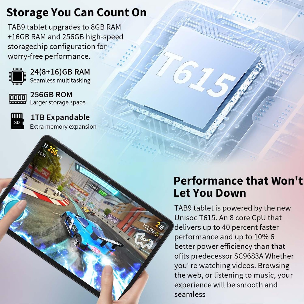 【Specifications】 Brand: System: latest Android 15 system Dual-band WIFI: 5G WIFI+2.4G WIFI RAM: 24GB ROM: 256GB (Expandable to 1TB) Battery: 8000mAh Screen size: 12 inches Resolution: 1280*800 pixels Front camera: 5 MP Rear camera: 8 MP Bluetooth:5.0 Charging interface type: Type-C Headphone jack type: 3.5mm 【Package includes】 1 * Android 15 Tablet 1 * Foldable Protective Case 1 * Bluetooth Keyboard 1 * Wireless Mouse 1 * Stylus Pen 1 * Tablet Charging Head 1 * USB-C Charging Cable 1 * Protective Film 1* User manual 【Android 15 Tablet + 12” IPS Large Screen】This tablet features the latest Android 15 operating system, which allows you to further customize your device with enhanced user protection and access. Improved photo quality, new themes and AI-generated wallpapers, updated health, security and data privacy, and broader accessibility. Enjoy unparalleled visuals with the 12-inch 2K fully laminated IPS Incell display. 12-inch Android 15 tablet 2000x1200 resolution with integrated T-color 3.0 color optimization technology for a more vivid and lifelike viewing experience than ever before! 【24GB + 256GB + 1TB Expandable + 8-core CPU + GMS】Android Tablet has up to 24GB RAM (8GB RAM + 16GB virtual RAM) and 256GB ROM storage, expandable up to 1TB via micro SD card (not included). How to check 8GB RAM: "Settings" → "System" → "Memory Expansion/Memory Expansion" → "Expanded Memory 8.0GB/Expanded Memory 8.0GB". The tablet runs the 1.6GHz Unisoc T615 8-core processor. This convergence ensures optimal performance for work and multimedia, providing a seamless, energy-efficient tablet experience. With the Mail G57 graphics processor, you can play popular mobile games smoothly. TAB9 Android Tablet is GMS certified! 【8000mAh + AI Camera 16MP / 8MP】Tablet has a built-in 8000mAh battery with upgraded battery life to provide you with longer usage time. Equipped with USB Type-C + separate 3.5mm headphone jack to meet various needs. 8MP front camera and 16MP rear camera can meet the needs of daily photography and video calls. 【2.4G/5G WiFi + BT5.0】The 2-in-1 Tablet Tablet supports high speed AC 2.4G/5G Wi-Fi and BT5.0 to keep your communication and entertainment available at all times. Suitable for coffee shops, offices, bedrooms and many more occasions. The strong receiving signal can keep you well connected at all times, allowing you to work happily, talk to your family, and connect with friends anytime, anywhere. 【Widevine L1 + Feature-Rich Tablet】This 12-inch tablet supports Widevine L1, allowing you to enjoy high-quality video playback on more than 30 major video apps around the world. Multi-purpose Tablet: comes with accessories: keyboard, mouse, case, stylus, screen protector, charger and charging cable. Tablet 7.8mm/ 55.8g, Easy to CarryEasily adapts to various usage scenarios by using different accessories.