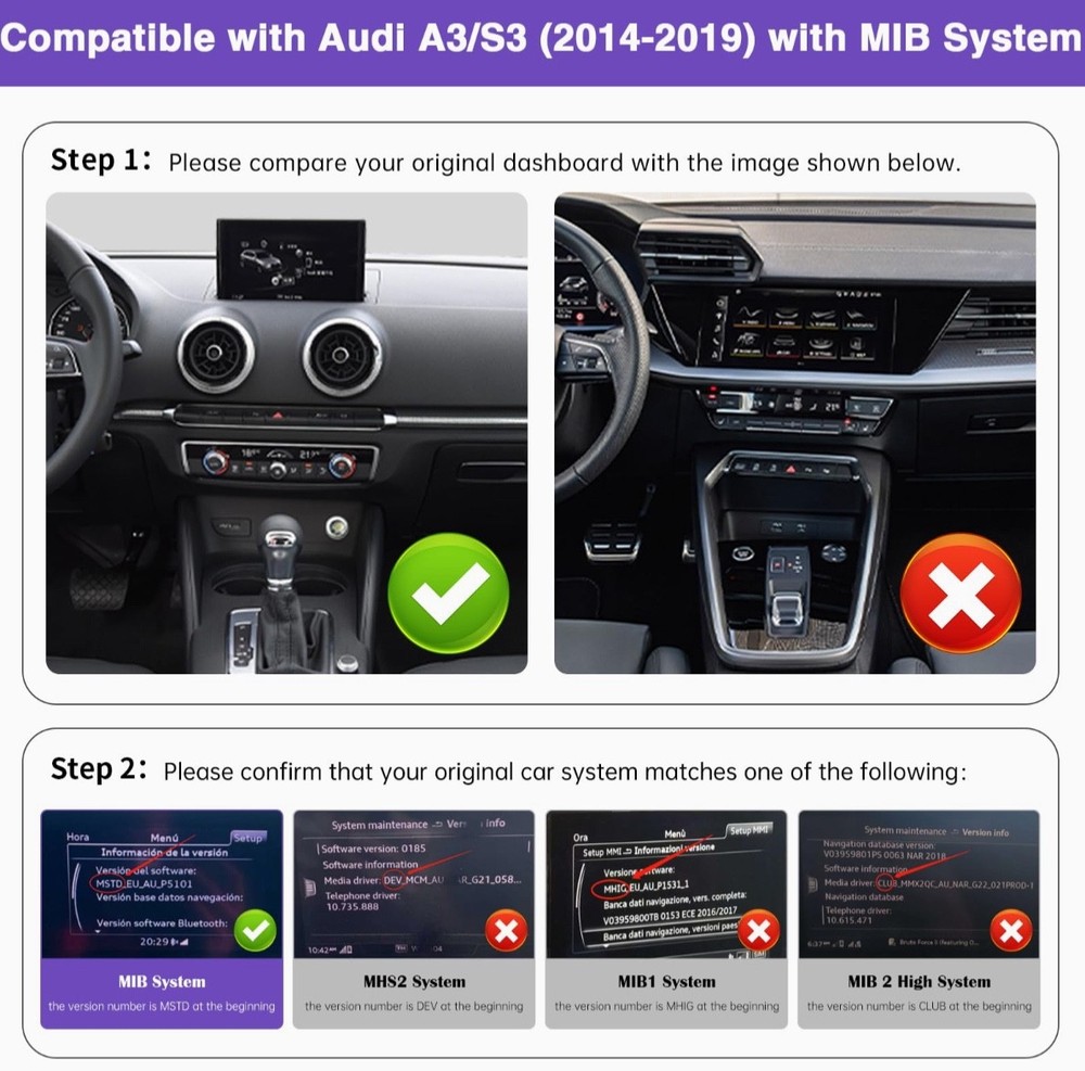 #2783 2025 Upgraded 12.3" Ultra-Narrow Touchscreen Wireless CarPlay Android Auto Receiver Compatible with Audi A3/S3 (2014–2019), for MIB System Brand ninetom Item Weight 2.35 Kilograms Manufacturer ninetom 【Pre-shopping Notes】This touchscreen is compatible with A3/S3 (2014–2019) with MIB system. Not compatible with other systems. Please confirm your car has MIB system before purchase. The unit runs on a Linux system, providing stable performance without freezing or lag even during long-term use. 【Upgraded 12.3" HD Touchscreen】This latest-generation 12.3-inch touchscreen features a high-definition 1920×720 IPS display with ultra-narrow bezels and a premium aluminum body. It upgrades the original screen while maintaining full compatibility with the factory system. The IN-CELL full lamination technology enhances clarity by eliminating air gaps, while the anti-reflection layer reduces glare by up to 75% for better visibility in sunlight. 【Built-in Wired & Wireless CarPlay/Android Auto】 Supports both wired and wireless CarPlay & Android Auto for GPS, calls, messages, music, and more via Siri or touch. Use Siri/Google Assistant hands-free for navigation, contacts, and notifications. Also supports screen mirroring for videos, maps, and other smartphone features on your car display. 【Supports Original Functions】The upgraded touchscreen retains all original car functions, including the radio, amplifier, joystick controls, and reversing camera, without altering the vehicle’s software. It supports both original and aftermarket features while adding Linux system enhancements for an improved experience. 【Dual System Switching】Easily switch between the Linux interface and your car’s original system with one click. The capacitive touchscreen keeps all factory functions—radio, controls, gauges, alerts, and reversing camera—while adding Linux features without altering the car’s original software or controls. 【1-Year Warranty & Installation Assistance】Installation won’t damage original wiring or affect your factory warranty. Professional installation is recommended if unsure. Contact us anytime—our team has more experience than most repair shops. Dashboard removal is needed for wiring. Most issues come from cable or setting errors, which we’ll help fix. Test all functions before reassembly.
