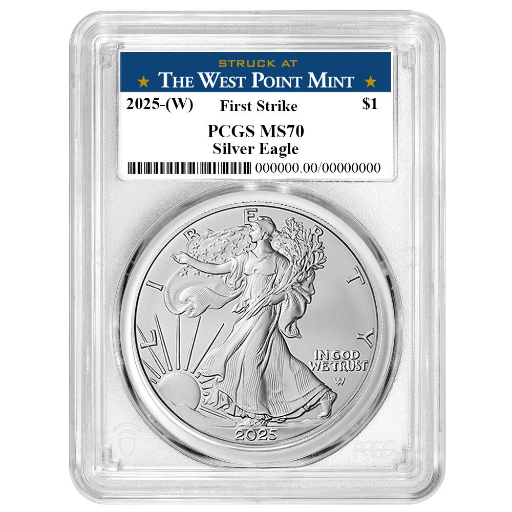 Free Shipping On All Orders Menu gold US Gold American Eagles American Buffalos Pre-33 Gold Gold Bars 1 oz Gold Bars Fractional Gold Bars Gold Rounds World Gold Coins Queen's Beast Series Canadian Maple Leafs S. African Krugerrands British Britannias Chinese Pandas Austrian Philharmonics silver US Silver American Eagles America The Beautiful 90% Silver 40% Silver Silver Rounds Silver Bars 1 oz Silver Bars 5 oz Silver Bars 10 oz Silver Bars Kilo oz Silver Bars 100 oz Silver Bars Silver Shot World Silver Queen's Beast Series Canadian Maple Leafs S. African Krugerrands British Britannias Chinese Pandas Austrian Philharmonics Mexican Libertads Australian Kangaroo's other Platinum Palladium Ancient Coins Error Coins Proof Sets Mint Sets Supplies and Publications auctions Store Categories Bullion Silver Eagles Gold Eagles Gold Buffalo Platinum Eagles First Spouse Gold Modern Commemoratives Ultra High Relief Pre-1933 U.S. Gold World Coins Error Coins Proof & Mint Sets Early U.S. Coinage Pre-33 U.S. Gold Morgan & Peace Silver $1 Dollars $1 Half Dollar 50c Quarters 25c Dime 10c Nickel 5c Small Cent 1c Supplies & Publications Original Government Packaging Ancient Coins No Reserve Auctions Other Store newsletter Add our store to your Favorites to receive our email newsletters about new items & special promotions. Sign up 2025 (W) $1 American Silver Eagle PCGS MS70 FS West Point Label Product Description Please note that these are business strike coins. PCGS will designate the U.S. Mint facility that struck these coins by including the mint mark in parentheses on the label. The mint mark contained in parentheses is not present on the coin. The American Silver Eagle is considered one of the most popular coins worldwide. The creation of these iconic 1 Troy oz of .999 fine silver coins was authorized through the Liberty Coin Act of 1985, and production began in 1986. Known to many as the official bullion coin of the United States, a redesign was introduced by the U.S. Mint in 2021. The original obverse design, based on Adolph A. Weinman’s 1916 “Walking Liberty” half dollar, has been updated with the help of modern technology. Now a closer reflection of Weinman’s original design, the obverse includes the addition of the traditional artist’s mark on the coin itself. As with the obverse, the reverse of the Silver Eagle also received an update in design. Before the summer of 2021, the design was that of the heraldic eagle of the United States, which was created by the former Chief Engraver of the United States Mint, John Mercanti. This design features an American bald eagle behind a heraldic shield with arrows and an olive branch in its talons. The new reverse design, also known as “Eagle Landing,” shows an eagle approaching a landing, carrying an oak branch to add to a nest. One of the U.S. Mint’s Artistic Infusion Program designers, Emily Damstra, created this new reverse design. Coin Features: 1 Troy oz .999 Silver Shipped in protective packaging Shop with confidence knowing when you buy from Pinehurst Coins, you are buying the best. Each coin has been carefully assessed by the Professional Coin Grading Service (PCGS) and is certified to be in near-perfect condition. These coins are shipped in their original PCGS certification slabs to protect their condition. Coins arrive in protective slabs courtesy of the PCGS Free Shipping on all orders The coin pictured is only a representation of the coin you will receive, not the exact coin (serial numbers will vary) If you have any questions or concerns, please do not hesitate to contact us. Our dedicated Customer Service team will be happy to assist you M-F from 9 am to 5 pm EST. Shipping Payment Returns About Us Shipping We offer free shipping on all of our listings! All items must be shipped directly to your registered eBay address, no exceptions. We will not ship it to an alternative or forwarding address. All of our packages are fully insured. Orders over $750.00 require Signature Confirmation. No insurance claim will be processed if the United States Postal Service or any other carrier designates the package as delivered via tracking number, regardless of circumstance. In general, we ship items using USPS First Class Mail or FedEx Ground. Other methods may be used depending on circumstance. eBay will post an estimated shipping time as soon as shipping information is uploaded to an order. This time frame is only an estimate, not a guarantee. Please be sure to verify that your order is correct prior to submitting payment. Once an order is placed it can only be canceled not adjusted. Orders are processed quickly and once they are moved to our shipping department an order can no longer be canceled, it would have to be returned (all returns are subject to restocking fees). Disclaimer: Once the item has left our facilities, it is under the control of the third party shipping service. We always do our best to provide our customers with speedy service; however some things are out of our control. There is always the possibility for a delay due to these third party services or the possibility of a product becoming damaged or lost in transit. The simple fact is, all of the above-described scenarios are unacceptable to us and we will never put this burden on our customers. If anything happens to a product in transit, we will always be willing to replace the product. Customer satisfaction is our number one priority and we do whatever we can to accommodate you. Pinehurst Coins will not accept purchases for any item that is mispriced due to technical issues, regardless if those issues are caused by eBay's system or our own. All mispriced orders will be canceled and your money will be completely refunded immediately. Payment For large orders with customers that we do not have a previously established business relationship, a wire may be necessary. This will be determined at the discretion of Pinehurst Coins. Payment is due at the time of checkout, no excep