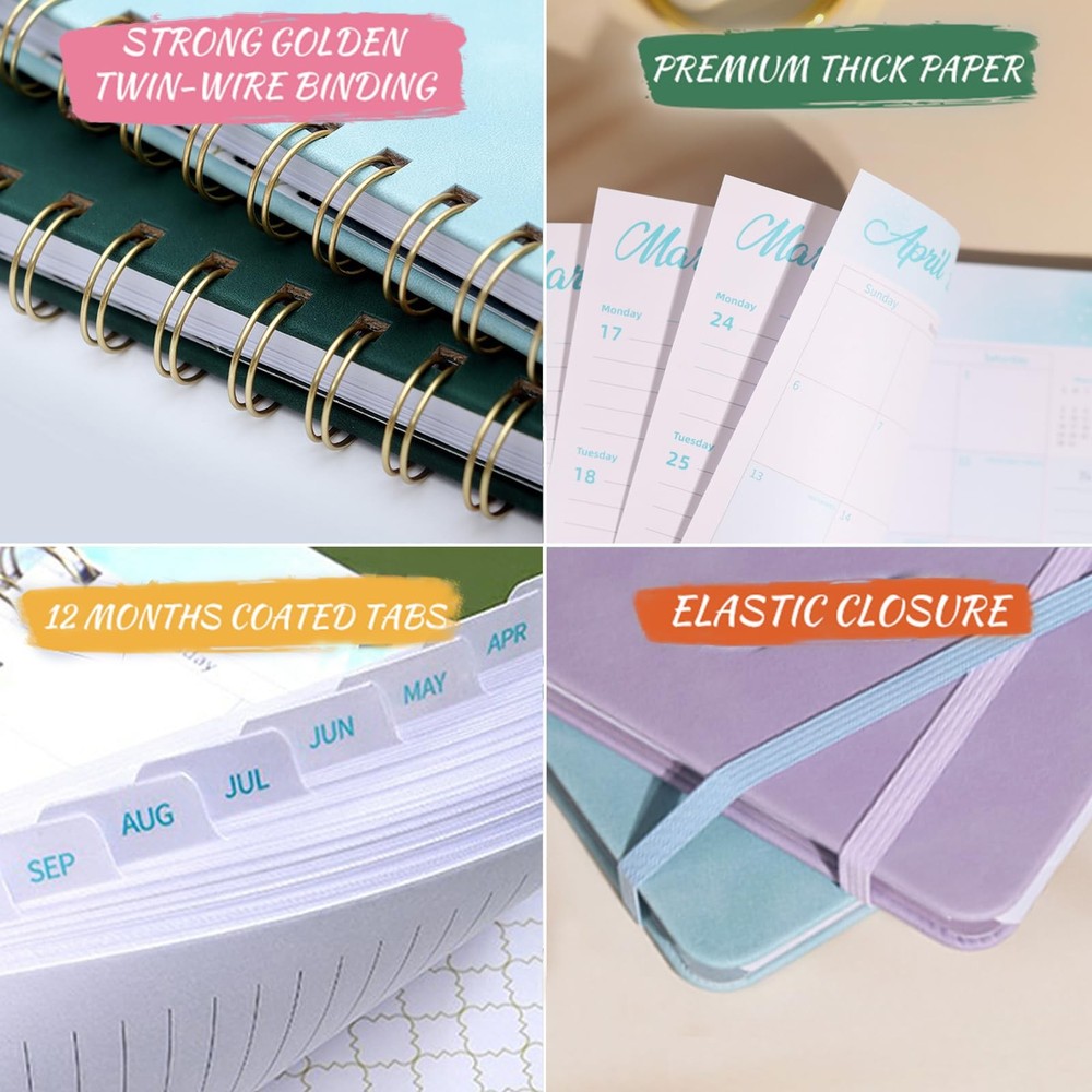 Stay organized and on track with the 2025 Planner Weekly and Monthly Academic Planner. This premium planner covers the entire year from January to December 2025, with daily calendar pages and ample space for notes and appointments. Measuring 6.4" x 8.5", it's a convenient size to carry with you. The twin-wire binding allows it to lay flat, while the tabs make it easy to navigate between months. The faux leather cover in a stylish green hue adds a touch of elegance, and the elastic closure keeps everything secure. An interior pocket provides a handy place to store loose papers or cards. With premium pages and a yearly agenda layout, this planner is the perfect companion for students, professionals, or anyone looking to stay organized in 2025. 2025 Planner Overview: This 2025 planner weekly and monthly is an ideal partner for keeping organised, from Jan 2025 to Dec 2025, 100 gsm premium thick paper, providing a smooth writing experience and preventing ink bleed-through. Size 6.4" x 8.5", easy to carry in a handbag or backpack for on-the-go planning. Soft and smooth skin feeling leather surface makes this 2025 monthly weekly planner notebook more distinctive and premium texture. Perfect for work, school, home Professional Content Design:This 2025 calendar monthly planner is so well organized, its layout corresponds perfectly to all your daily needs, it comes with Quick Reference Information, Calendar 2025 2026 Yearly Overview, UK/US/CA Holidays Reminder, the whole Month Overview, To-Do lists and Notes. With ample space for notes, appointments, and detailed daily planning, this calendar book is a comprehensive planning tool for busy individuals More Practical Functionalities:Monthly Tabs / Inner Pocket / Spiral Bound / Elastic Closure, enhancing usability and organization. High quality and well-made, secure and durable. The spiral planner 2025 perfect as a life day planner, academic planner, school planner 2025, appointment planner, work planner , happy planner 2025, student/teacher planner 2025 or Personal Organiser Convenient Monthly View: Each monthly spread of the 2025 monthly planner contains an overview of the month and a to do list section, offering a comprehensive snapshot of the schedule. Easily plan and prioritize tasks, deadlines, and events with just a glance, Stay organized and inspired throughout Efficient Weekly View:The week is shown using two pages, with each day having enough room to put appointment times, addresses, to-do lists. Note Section for to schedule your week ahead, jot down summary and review of the week