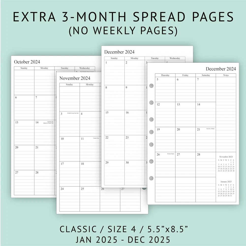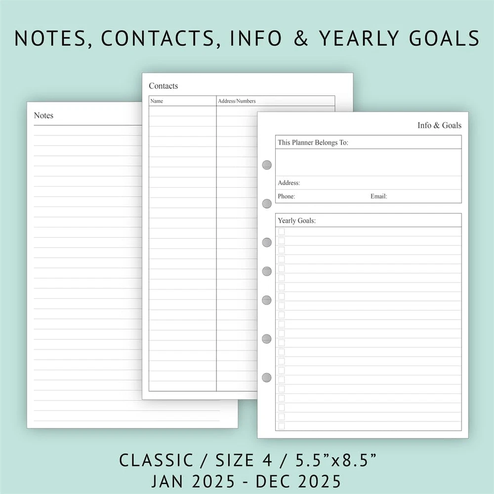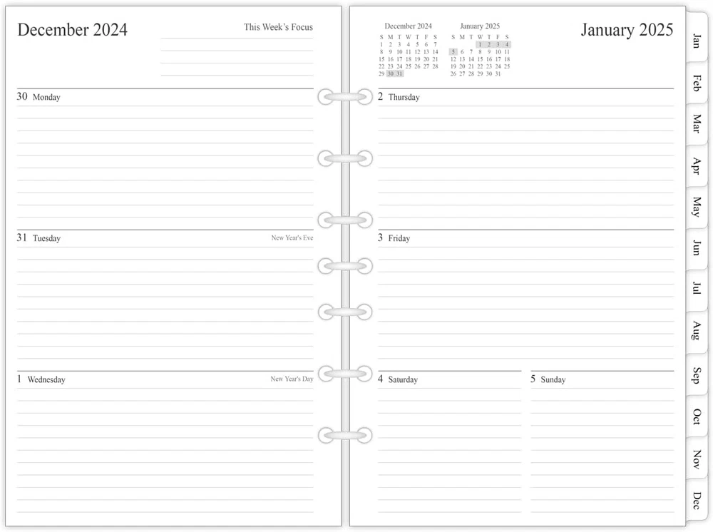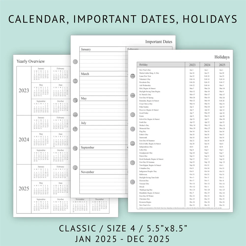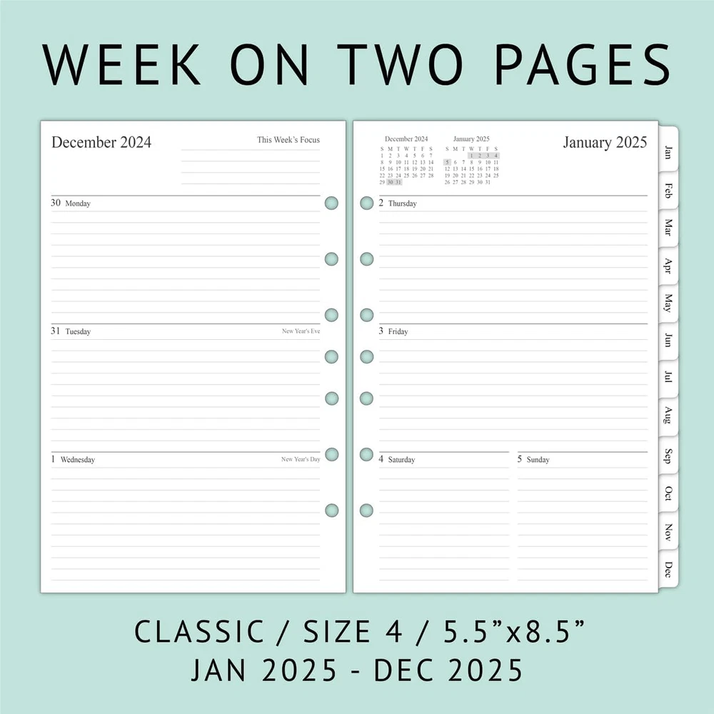 2025 planner refills 5.5"x8.5" for 3-Ring or 7-ring mini binders (half letter size), Jan 2025 to Dec 2025 2 page monthly spread with ruled daily blocks, calendar & notes section, laminated month tabs to allow quick turning Weekly spread includes Week's Focus & 2-month calendar sections on the top and a Monday to Sunday format Feature: 2-year calendar & hollidays pages, contact, yearly goals, important days, contacts, and notes pages, extra 3-month spread pages for early planning (Oct 2024 to Dec 2024, No Weekly Pages) Compatible with Day Timer (desk size 7-ring binder), Franklin Covey (classic 7-ring binder), Avery (3-ring mini binder) Product Description Refill your 3 ring or 7 ring mini binders (5.5"x8.5") and keep organized with this 2025 weekly planner refills that feature coated monthly tabs, yearly goals, important dates, holidays and notes pages. 2025 Weekly Planner Refills Compatible with below brands and similar 3-ring or 7-ring mini binders: AT-A-GLANCE, desk size Avery, mini binder Franklin Covey, classic PLANNING PAGES OVERVIEW