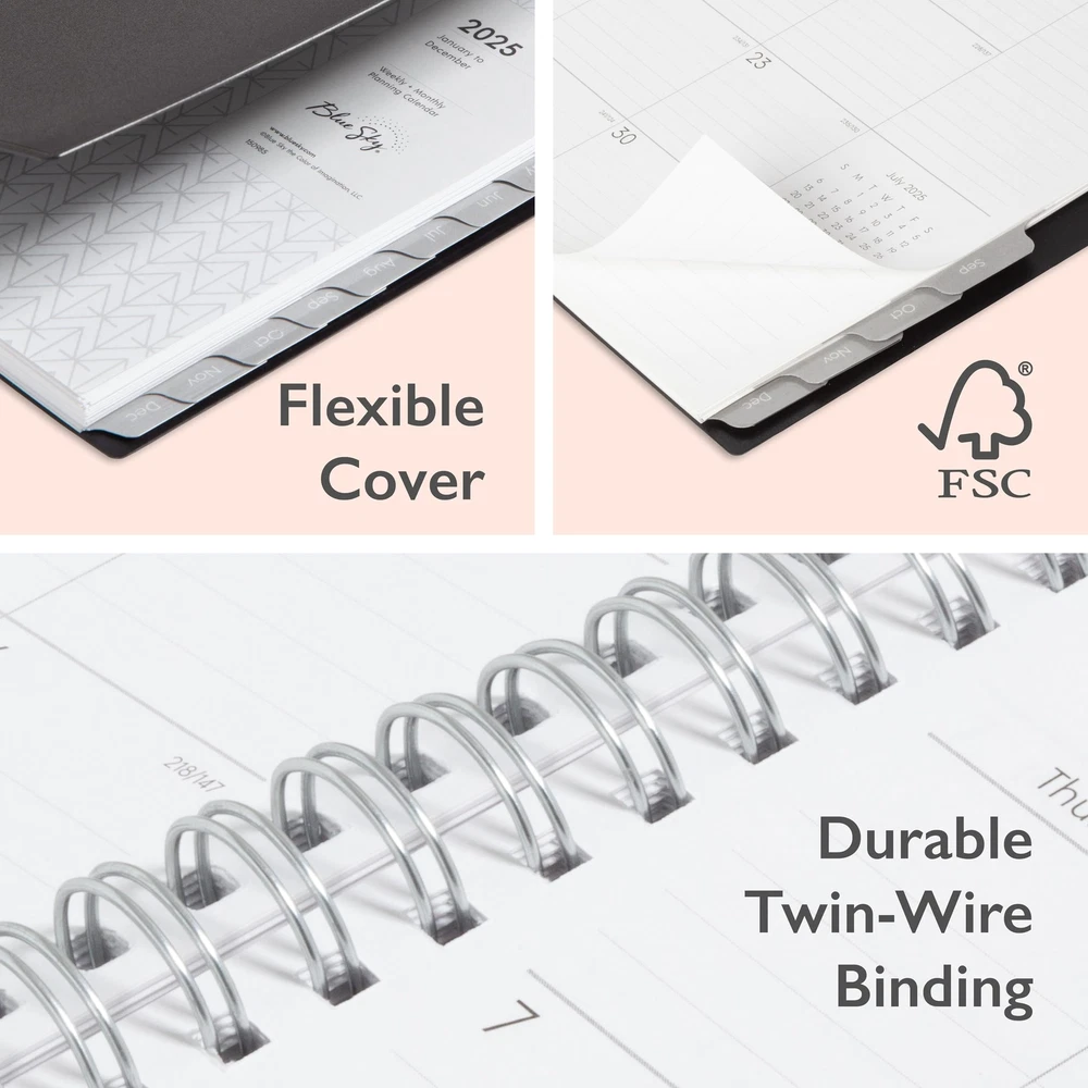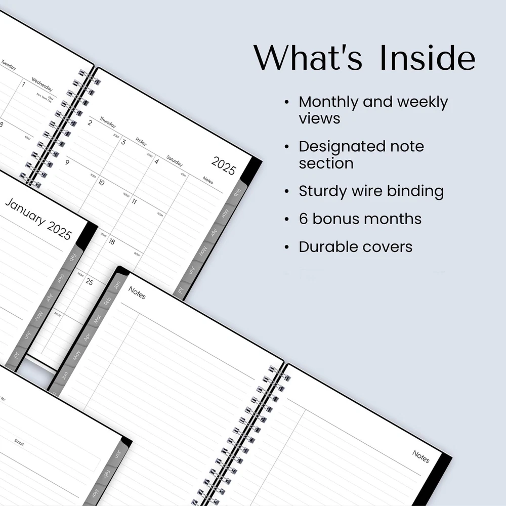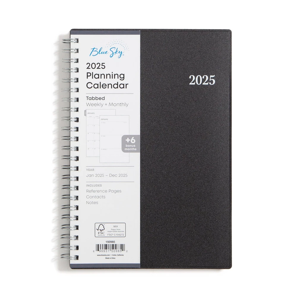 January 2025 - December 2025 day planner with 12 months of monthly and weekly pages for easy year-round planning; 6 additional monthly pages (July 2024 - December 2024) are included Monthly view pages contain previous and next month reference calendars for long-term planning, and a notes section for important projects; Major holidays listed, elapsed and remaining days noted Weekly view pages offer ample lined writing space for more detailed planning, allowing you to keep track of your appointments, reminders, ideas and to-do lists every day of the week Yearly calendar planner includes a convenient list of holidays, reference calendars, contacts pages and extra notes pages to accommodate your scheduling needs Printed on FSC-certified paper for clean writing space, with premium quality covers in rich colors and durable, coated tabs that withstand constant use throughout the year