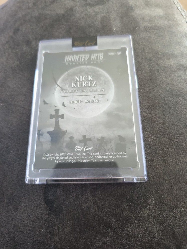 The product is a 2025 Wild Card Haunted Hits Nick Kurtz Las Vegas Athletics trading card. This card is a valuable collectible for baseball fans. The card is in near mint or better condition. With its unique design and limited availability, this card is sure to be a coveted item for sports trading card enthusiasts.