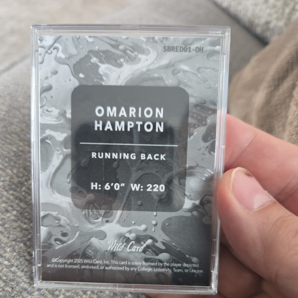 The 2025 Wild Card Spalt Omarion Hampton RC 8/9 trading card is a standard-sized card featuring the rookie player Omarion Hampton from the Los Angeles Chargers in the National Football League (NFL). This original card is part of the 2025 Wild Card Splat set, with a limited print run of 9 and a serial number for authenticity. Manufactured by Wild Card in the United States, this card is made of card stock and comes in near mint or better condition. Additionally, it includes features like being encased and belongs to a parallel/variety insert set, making it a valuable collectible for football fans and card enthusiasts.