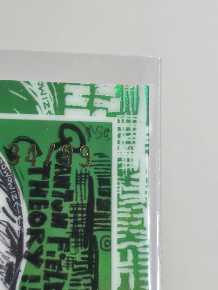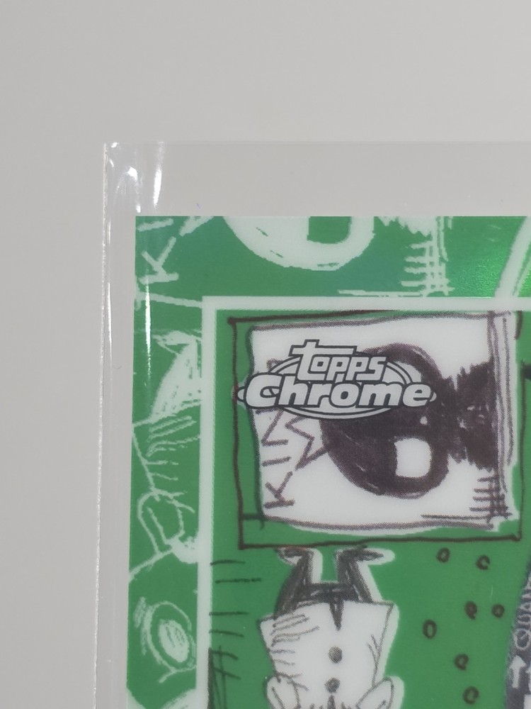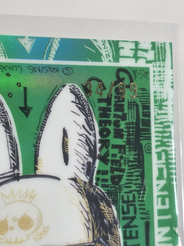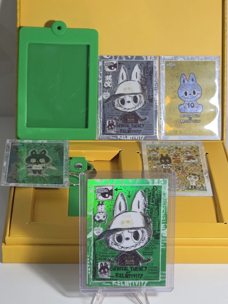 The product is a 2025 Topps Chrome Labubu The Monsters 10th Heaven card, featuring a standard size and English language. This card, green, numbered 34 out of 99. Cards was carefully pulled and sleeved right away. Comes with 4 base cards , original open box, fanatic mag case and never used matching green silicone case holder.