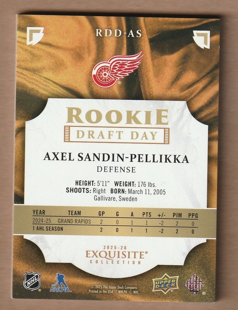Photos of the item that you will receive are shown in the photo. 2025-26 Black Diamond AXEL SANDIN-PELLIKKA Exquisite Rookie Draft Day 019/349 Any items shipped to a Canadian address must pay appropriate sales tax. WE COMBINE SHIP 1.00 FOR ADDITIONAL ITEM. Shipping within Canada is $3.95, to the USA is $9.50, anywhere else $12.00. To All USA Customers We Ship From Calais, ME Every Tuesday, This Allows For A Tracking Number and A Signature If Required. ALL USA MAIL WILL STILL GO VIA CALAIS,ME EVERY TUESDAY. Please send me a message if you have any questions. Thanks!