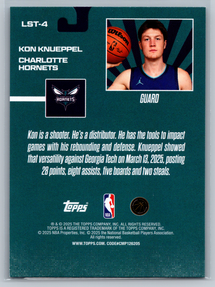 The product is a 2025-26 Topps Basketball trading card featuring NBA legend Kon Knueppel in his Charlotte Hornets uniform. This limited stock card, part of the Legends set, is a must-have for collectors and fans of the sport. Though not autographed, this card showcases the player in a unique and sought-after variation, making it a valuable addition to any sports memorabilia collection.