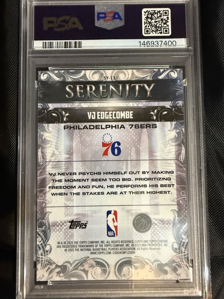The product is a 2025-26 Topps Chrome basketball trading card featuring VJ Edgecombe of the Philadelphia 76ers. This specific card is a yellow refractor parallel with a print run of 275 and is part of the Serenity insert set. It is graded a 10 by Professional Sports Authenticator (PSA) and is a rookie card. The card is serial numbered and comes as a single sports trading card in the category of sports memorabilia and trading cards.