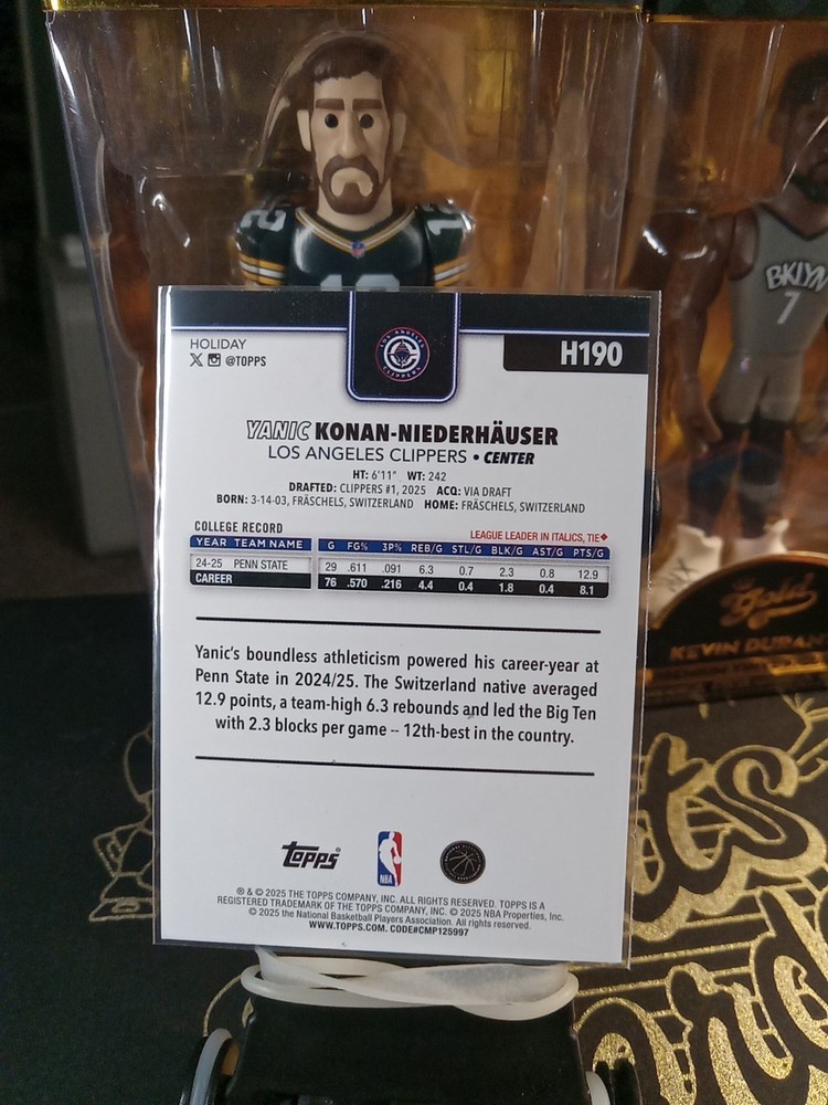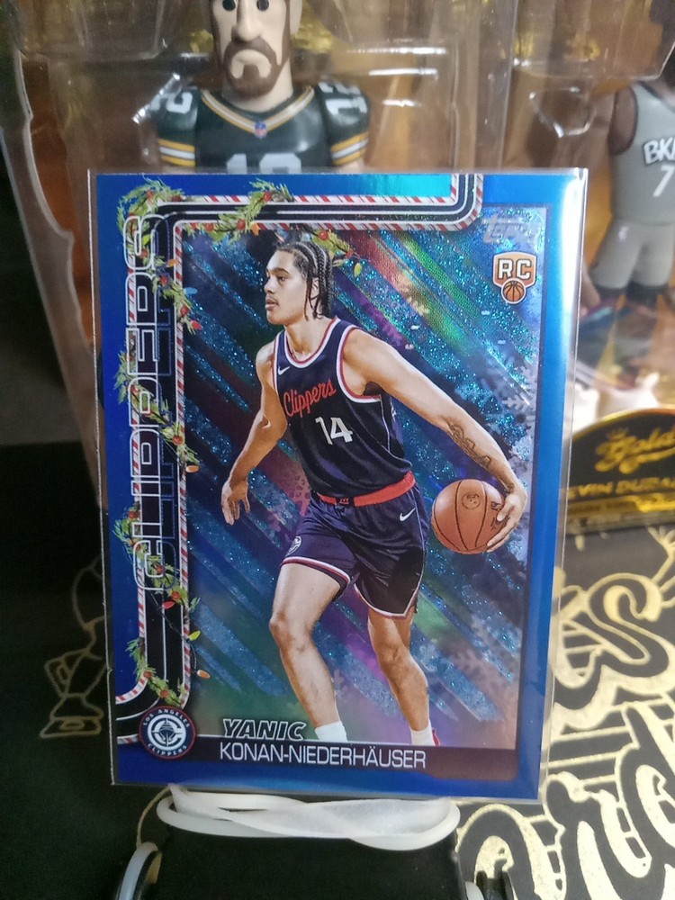 The product is a 2025-26 Topps Holiday sports trading card featuring Yanic Konan-Niederhauser of the Los Angeles Clippers. This card is part of the Holiday Metallic Blue Glitter parallel variety set, making it a rare and collectible item for basketball fans. As a rookie card from the National Basketball Association (NBA), it holds value for collectors looking to add unique and sought-after pieces to their collection. The card is in near mint or better condition, ensuring its quality and appeal to fans of the sport.