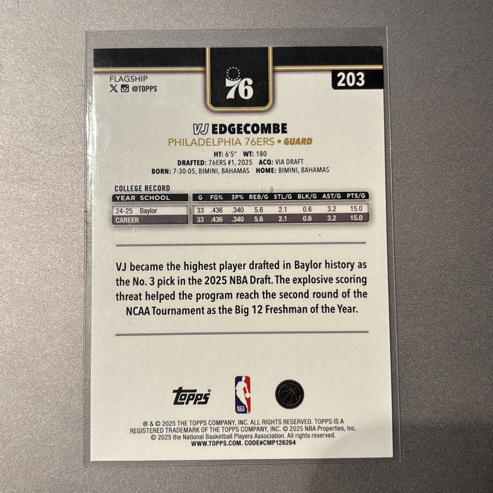 The 2025-26 Topps VJ Edgecombe #203 Black Friday BLACKOUT Foil Exclusive SP trading card is a rare and highly sought-after collectible for basketball fans. This limited edition card features a black foil design, making it a standout piece in any collection. Authenticated by Topps, this hard-signed card of VJ Edgecombe from the Philadelphia 76ers is a must-have for fans of the National Basketball Association. Made of sturdy 20 Pt. card stock, this exclusive sports trading card is a valuable addition to any basketball card collection.
