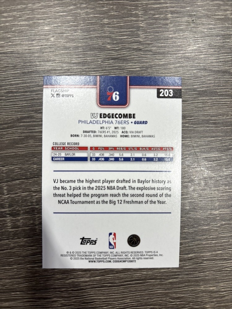 The 2025-26 Topps VJ Edgecombe Rookie RC Holo Foil Parallel is a standard-sized sports trading card featuring VJ Edgecombe of the Philadelphia 76ers in the NBA. Manufactured by Topps in 2025. It is part of the 2025-26 Topps set and is in near-perfect condition, making it a valuable collectible for basketball fans and trading card enthusiasts. Condition is exactly as shown in the photos. Please review all images carefully before purchasing.