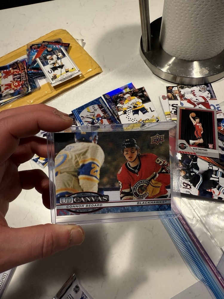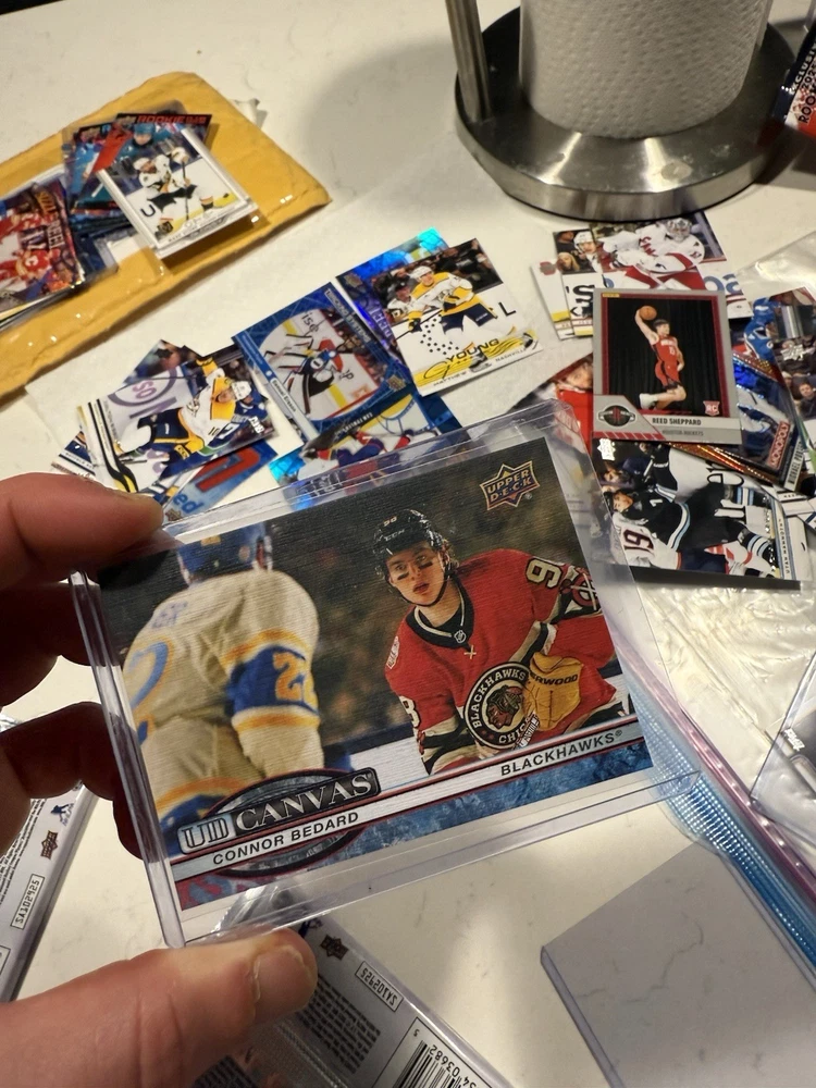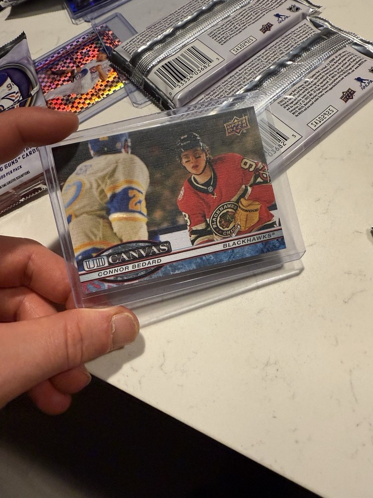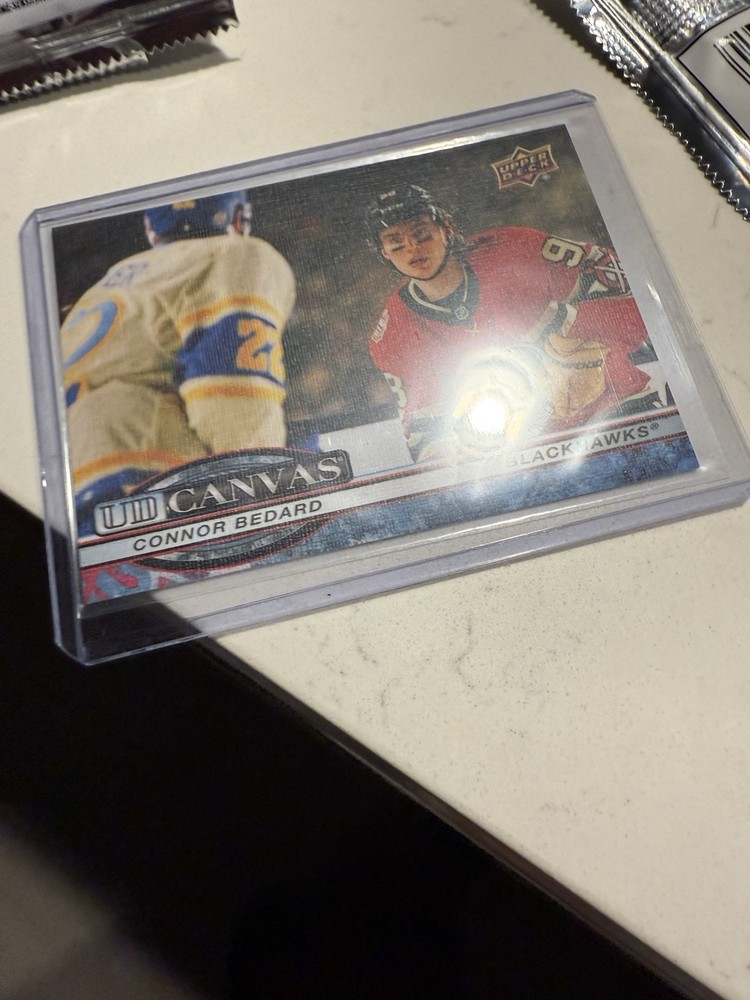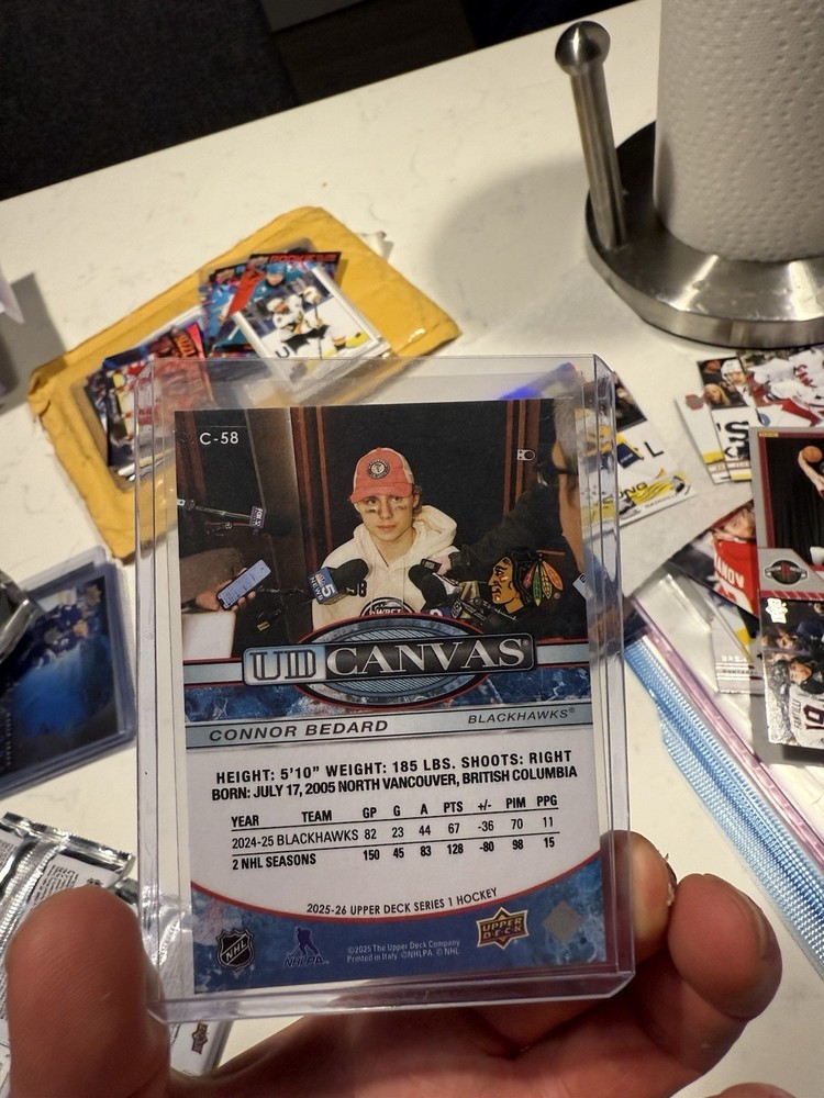 The product is a 2025-26 Upper Deck Series 1 sports trading card featuring NHL player Connor Bedard from the Chicago Blackhawks. This specific card is part of the Ud Canvas insert set, making it a unique addition to any ice hockey card collection. With a focus on showcasing up-and-coming talent in the league, this card is a must-have for fans of both the player and the sport.