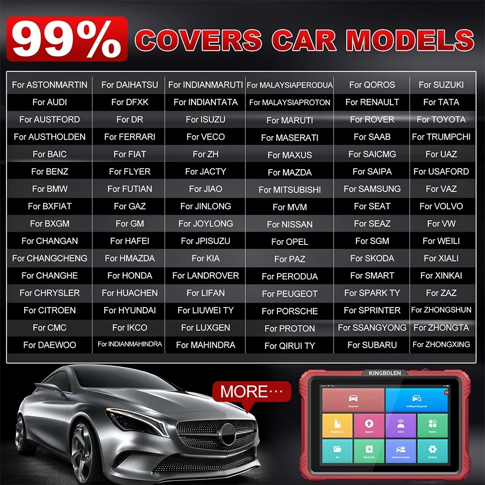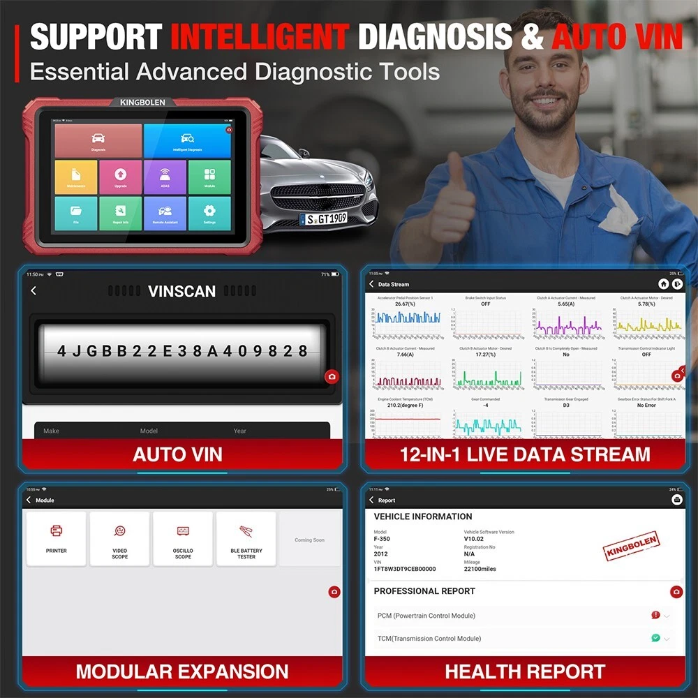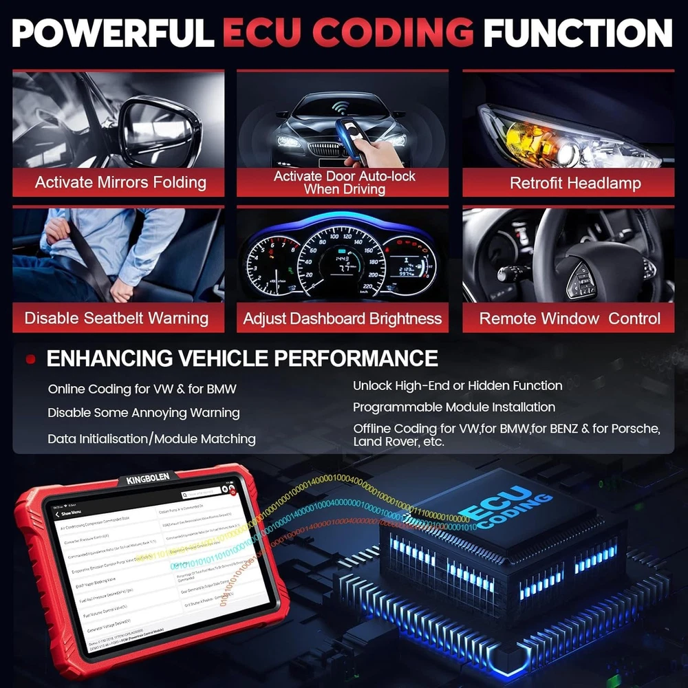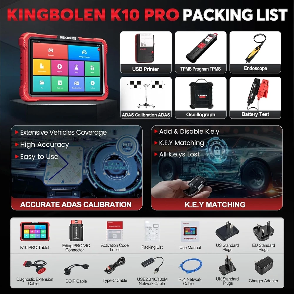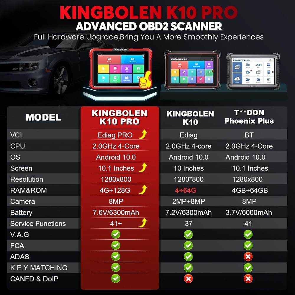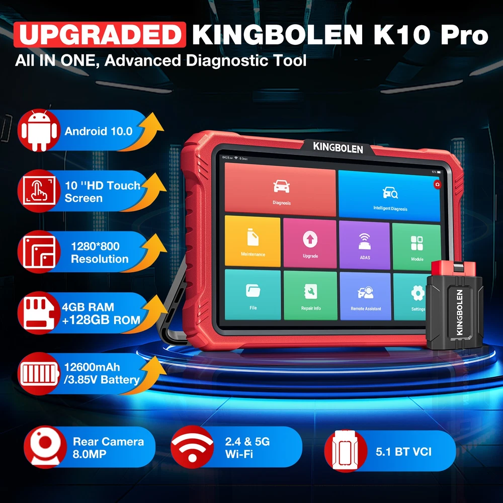 KINGBOLEN K10 PRO Bidirectional Obd2 Scanner Bluetooth Diagnostic Tool, Good Helper for Solving Car Problems, Same as Thinktool Pros, 2 Years Update. Powerful Hardware: Equipped with 10 inch HD touch screen, Front/Rear Camera 8.0MP, powerful Android 10.0 OS, 4+64GB extended memory, lasting 3.7V/12600mAh(7.6V/6300mAh) battery and WIFI/Bluetooth diagnostics. Subscription F-ee: Comes with a 2-year up-date, after which you need to renew your subscription to continue using the full featured software. The subscription f-ee is USD399/year. Built-in Web Browser: The device has a built-in web browser, so you can quickly find information and view repair videos without using other devices, which is very convenient and considerate. Adjustable Kickstand: Able to keep the device standing on the desk, or hang the device on the steering with 180 degree rotation. OE-Level Full Systems diagnosis: It can read/clear fault codes, read live data/freeze frame, read control module information, actuation tests and reset functions for TPMS,ECM,BCM,ABS,SRS,TCM,BMS,SAS,A/C & RTM system etc... Topology Map Design: You can simply click the module to check the fault and quickly determine the root cause. 41+ Reset Services: The device supports matching, coding, programming of most vehicles' programmable modules, and most commonly used maintenance and reset functions: Oil Reset; Elec. Throttle Adaption; IMMO Service;Injector Coding; Brake-pad Reset; Steering Angle Reset; ABS Bleeding; AFS Reset; Battery Matching and A/T Learning... Guidance Function: It can provides step-by-step maintenance guide for Volkswagen/for Audi/for Skoda/for seats. Efficient Bi-Directional Control: Perform real time active test that can send commands to the vehicle’s ECU to drive the actuators to work, such as ABS, windows, doors, valves, wipers. ECU Coding: Allows you to activate hidden functions, such as Auto Side Mirror Folding, Auto Engine Start-Stop etc. Offline Coding: Compatible for Mercedes-Benz cars. Online Coding: Compatible for Volkswagen, for Audi and for BMW cars. Intelligent Diagnosis: Supports powerful intelligent VIN recognition technology, which is convenient, fast and efficient. Health Report can be generated after diagnosis. Modular Expansion: Printer, video scope, scope box, battery test clip, wireless TPMS tool. Battery Tester: Supports battery health test, start system test and charging health test. TPMS: With wireless TPMS tool (optional), TPMS activation, programming and learning functions can be supported. Wide Vehicle Coverage: Supports most car models after 1996 year of 100+ car brands, such as Ford, for GM, for Dodge, for Jeep, for Mazda, for Audi, for BMW, for Mercedes, for Volkswagen, for Honda, for Toyota and for Hyundai, etc and 28 worldwide languages(EN, FR, ES, DE, IT, RU, PT, JP, TU, POL...) The KINGBOLEN K10 PRO has ECU coding capability to perform Offline/Online Coding to match/Initialize components' adaptive data after repairing/replacing some components, and activate Hidden Functions: Personalized Settings to activate high-end functions or disable any annoying features. ECU CODING: · Offline Coding: Compatible for Mercedes-Benz cars; · Online Coding: Compatible for Volkswagen, for Audi and for BMW cars; · Unlock the hidden functions: To activate or disable some functions: 1. Deactivating the Start/Stop function; 2. Beeping when unlocking and locking; 3. Locking the doors once a certain speed is reached(e.g. from 15 km/h); 4. Seatbelt warning sounds; 5. Mirrors automatically folding and unfolding; 6. Closing the windows after locking the car door etc. ... Supports 41+ Maintenance Functions: 1. TPMS Reset -- When replacing TPMS sensors or the signal from the sensor is lost it can quickly look up the tire sensor from the vehicle’s ECU, reset tire pressure and turn off the tire pressure MIL. 2. ABS Bleeding -- When the ABS contains air, the ABS bleeding function must be performed to bleed the brake system to restore ABS brake sensitivity. 3. Oil Reset -- Allows you to perform reset for a new calculation of the Engine Oil Life system once changed the oil. 4. Electronic Throttle Adaption -- Utilize the car decoder to initialize the throttle actuator so that the learning value of the ECU returns to the initial state. 5. Brake Reset -- To deactivating and activate the brake control systems, assist with brake fluid control, open and close brake pads, and set brakes after disc or pad replacement. 6. SAS Reset -- It helps clear the faulty steering angle sensor memories to reset the steering angle and plays an important role in the steering angle sensor calibration. 7. Battery Matching -- Enables you to perform resetting operation on the monitoring unit of battery,in which the original low battery fault information will be cleared. 8. Injector Coding -- After the ECU or injector is replaced, injector code of each cylinder must be confirmed or re-coded so that the cylinder can better identify injectors to accurately control fuel injection. 9. Suspension Matching -- When replacing the body height sensor in the air suspension system, or control module or when the vehicle level is incorrect, this function can adjust the body height sensor for level calibration. 10. AFS Reset -- It is used to initialize the adaptive headlamp system. 11 . Gearbox Matching-- This function can complete the gearbox self learning to improve gear shifting quality 12. Sunroof Initialization -- This function can set the sunroof lock off, closed when it rains, sliding/tilting sunroof memory function, temperature threshold outside the car etc... (Enter from the all-system diagnostic menu to unlock more system special functions, and effectively handle the reset and relearn of most cars. ) Note: Not universal for all vehicles. Available maintenance functions vary depending on the make, year, and model. Wide Vehicles Coverage: Supports 100+ vehicle brands and 10000+ car models,such as, Ford, for GM, for Dodge, for Jeep, for Mazda, for Audi, for 