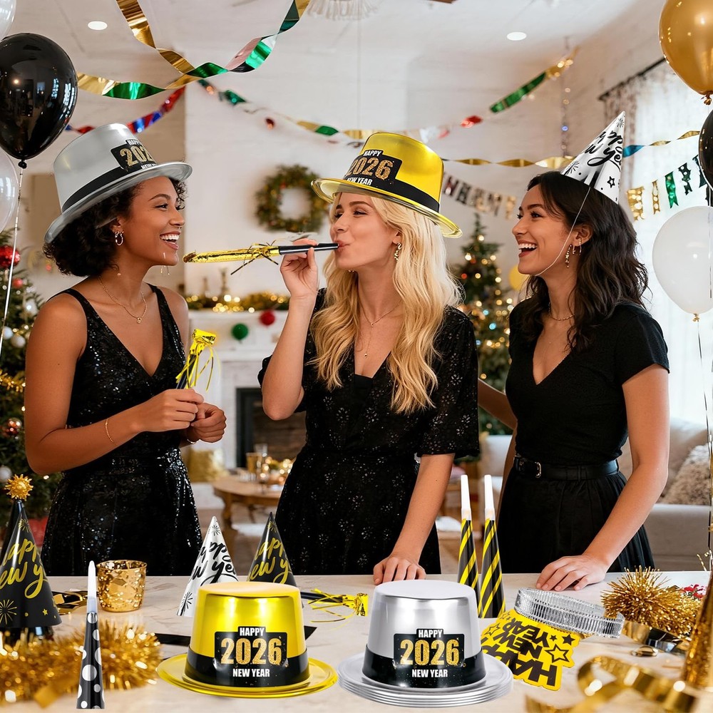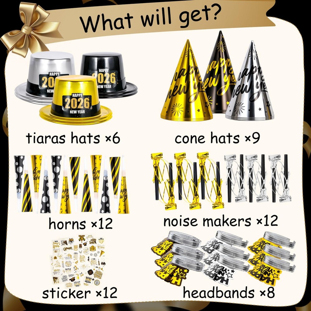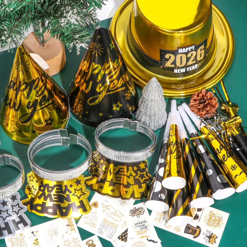 new year party favors 【2026 New Years New Supplies】: 60 Packs with 9 cone hats, 9 happy new year headbands, 6 top hats, 12 party blowers, 12 party horns, 12 tattoos. Happy new years eve party favors come in a great assortment of colors and styles, adding cheerful atmosphere for 2026 new year eve events or scenes! 【Sparkling 2026 New Years Theme】: Welcome the new year in style with our exclusive black, silver, and gold color scheme, created specifically for 2026 new year eve celebrations. 【Safe Material】: New years eve accessories made from premium, tear-resistant materials, our new years eve party hats and horns are designed to withstand the excitement of your biggest parties. 【Widely Uses】: 2026 new years eve party favors are perfect for new years eve celebrating, new year themed birthday party, new year themed events, Christmas, holiday party, families gathering, friends gathering, anniversaries, 2026 happy new years decorations and any other special events! bringing lots of fun for next year! 【Endless Fun】: Everything for the celebration in one set! Includes new year themed headwear, horns, headbands, and blowouts to create an instant festive atmosphere. new year party favors set for kids is a fabulous addition to new year activities and kids will enjoy memorable new year night with families and friends.