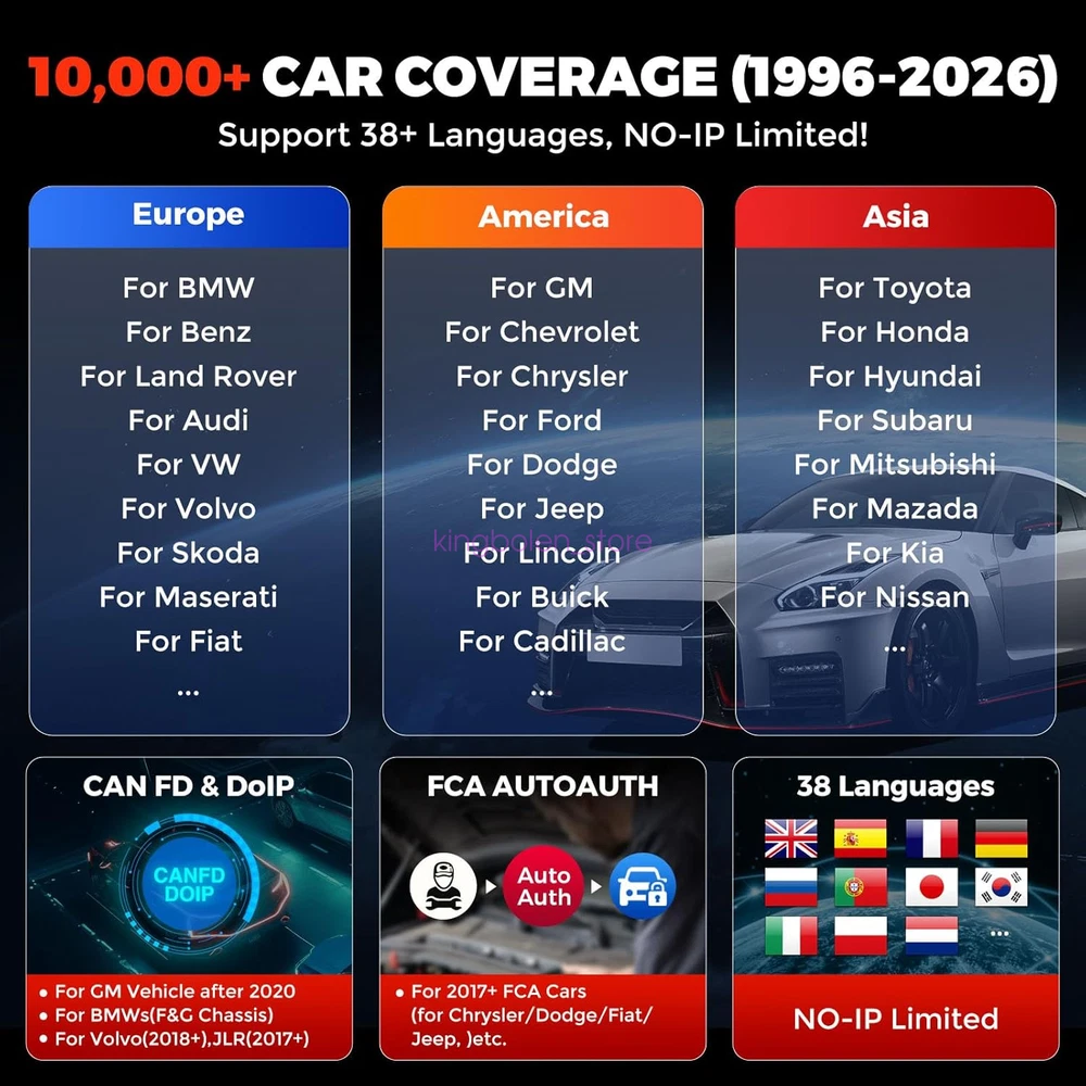 KINGBOLEN K8 PRO 8inch Car full system Scanner bluetooth with 42 Special service, support EC~U Coding, Active test+ Android 10 OS running on 8-inch HD IPS Touch Screen + 64GB Memory + Lifetime free update online KINGBOLEN K8 PRO Language: English, German , Spanish , French , Italian , Japanese , Portuguese , Russian , Polish , Turkish , Dutch , Hungarian , Chinese Traditional. It will add these languages soon : Korean , Greek , Arabic , Denish , Persian, Romanian, Croatian, Finnish, Swedish, Czech KINGBOLEN K8 PRO Professional Diagnostic Tool CAR REPAIR SHOPS & MECHANICS 's First Choice !!! KINGBOLEN K8 PRO is a well-balanced bi-directional scan tool. It offers a decent number of OBD2 functions in addition to bidirectional tests. Experience comprehensive and OE-Level OBD2 diagnostics, ECU coding, Live data streaming, Active testing and AutoVIN technology for identifying vehicles easily. You’ll love it if you are a DIY mechanic or enthusiast. KINGBOLEN K8 PRO supports Full system diagnostic : The Full Systems of the car mainly including Drive System, Chassis System, Body System, Electrical system : 1.PCM(Drive System): Engine, Transmission, Transfer case, Electrical Machine Electronics, Fuel Pump, Gear, and more... KINGBOLEN K8 PRO OBDII Car Automotive Diagnostic Tool OBD2 Scanner OBD 2 Code Reader TPMS Functions PK Automotive Scanner 2. Chassis System: Accumulator Management Electronics, Steering, Integrated Chassis Management, Tyre Pressure Control, Active Cruise Control, Braking System, Suspension, TPMS and more... 3.BCM(Body System): SRS Airbag, Camera, Audio Radio, Gateway, Cluster Dashboard, Rain Sensors, Charging Interface Module, Parking Assistance, Power Control Unit, Touch box, Light, Battery Charging System, Head up Display, Wipe Control System, Roof, Seat & Door Motor system, Immobilizer, ABS ESP system, Air Condition.Electric Windows, Telephone, and more... 4.Electrical System: Including Centralized control system for engine and power transmission, Chassis integrated control and safety system, Intelligent body electronic system, Communication and information / entertainment system. OBD2 Diagnostic Tools Professional Full System Bi-Directional Control AF Adjust DPF Injector TPMS Automotive Scanner It supports the detailed Function : --read fault codes: read and decode the DTCs to identify where the fault location is; --clear fault codes: erase the DTCs to turn off the MIL after repairs; --retrieve ecu information: allows you to retrieve vehicle information; --Graph live data stream: view the dynamic data stream to determine vehicle condition --ECU Coding : Match, learn, or code the new ECU; Customize your car, unfold the hidden features, or disable the annoying functions; Reprograms the adaptive data for certain components after repairs. --Active Test ( Bi-directionnal Control ) : Actuate solenoids and actuators for active testing, send commands to systems/components to test their working status, without using the vehicle controls. Diagnostic Tool Scanner Automotivo ECU Coding OBD2/EOBD OBD PK MS906BT MS908S MS906 With the Diagnose Function , you can enhance performance, save energy, reduce emissions and more as following: For Engine: detect common issues as Poor lubrication, Failing oil pump, Oil deposits and debris, Inadequate fuel and air compression, Leaking engine coolant, Blocked engine radiators, Prolonged engine detonation, Damaged oxygen sensors, Aged spark plugs, etc. For SRS: pinpoint the trouble area as: a bad seat belt, a corroded crash sensor, or some water intrusion in a connector, etc. For ABS: diagnose Blown sensor fuse, Low brake fluids, and Faulty sensor, etc. For Transmission: avoid Grinding or shaking sensation in gear, Whining, humming or clunking noises, Burning smells, Gears Slipping, Low or Leaking Transmission Fluid, etc. Kingbolen K8 PRO Automotive Scan Tool Map Bi-Directional Control ECU Coding Full Diagnostics & 42+ Resets Support DoIP & CAN FD For TPMS: verify problems of Low tire pressure, Faulty in tire pressure monitor control module, Unknown tire sensor, Failure to identify tire sensor, etc. KINGBOLEN K8 PRO supports ECU Coding and Active tester function : ECU Coding : the advanced coding function is used to re-flash the vehicle control modules, which allows you to update the computer software on the vehicle to the latest version, as well as to reprogram adaptive data for certain components after making repairs or replacements, providing solutions for the issues of drivability, fuel efficiency, power loss, fault codes, durability of mechanical parts etc. But please note, ecu coding are NOT universal for all vehicles, please check compatibility with VIN number before purchase. Active Test & Bi-directional Control : Bi-Directional Control capability and is capable of performing Active Tests to access vehicle-specific subsystems and component tests. The tester outputs commands to the ECU to drive the actuators in order to determine the integrity of the system or parts by reading the ECU data, or by monitoring the operation of the actuators .For example , x431 v have the ability to actuate relays, injectors, coils, or perform system tests, etc. Also it will actuate solenoids valve and actuators for active testing to identify the error easily moreover. The bidirectional functions are quite extensive. even open an e.g.r. valve and seeing the difference in idle response and oxygen sensor voltage. Please note: Active tests are NOT universal for all vehicles, check compatibility with VIN number before purchase. Active tests vary depending on the manufacturer, year, and model, and only the available tests display in the menu. KINGBOLEN K8 PRO Support TPMS Diagnostic function : ( It need works with ThinkTool tpms G1 ) KINGBOLEN K8 PRO can work with wireless tire pressure diagnostic tool (optional accessory) toachieve the features of TPMS activation, programming and learning. a) Activation: to activate the sensor's IlD, wheel pressure, sensor frequency,