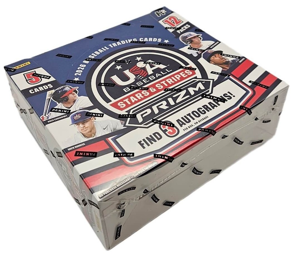 2026 Panini Prizm Stars & Stripes Baseball - Sealed H2 Hobby Box 12 Packs Per Box - 5 Cards Per Pack 3 Autographs Per Box For the first time ever, Stars & Stripes will be featured on the iconic Prizm brand! Search for Autographs of USA Baseball players, including Jorvroskie Lane Jr. and Jacob Seamon, among others! Look for the ultra-rare Color Blast insert! Find an incredible roster of Autographs, including Roch Cholowsky, Grady Emerson and AJ Gracia! 3 Autographs 18 Prizm Parallels 9 Inserts/Insert Parallels Find an array of USA Baseball athletes in the 200-card base set, featuring players like Liam Peterson, Ace Reese and Drew Burress! Inserts: Look for the ultra-rare and always stunning Color Blast insert, featuring the top names in USA Baseball, past and present!