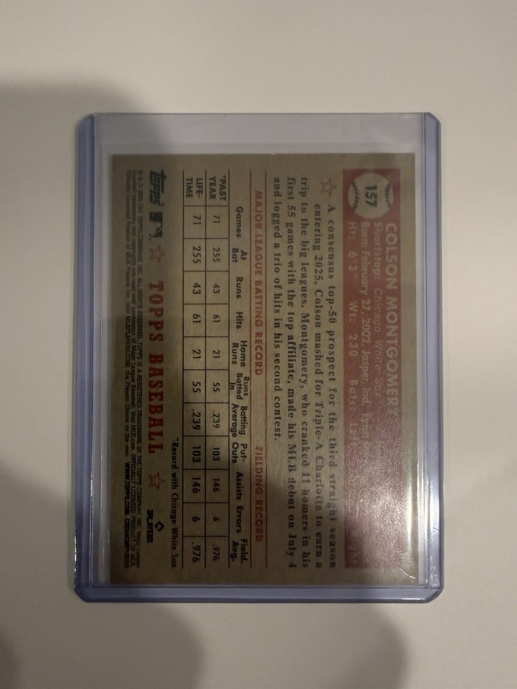 The product is a 2026 Topps Series 1 trading card featuring Colson Montgomery of the Chicago White Sox. This specific card is a 1952 variation rookie SSP RC, manufactured by Topps. It is a standard-sized card made of 20 pt. card stock