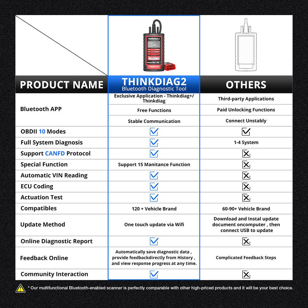Turn Your Smart Device Into A Professional Technician's Diagnostic Tool ✔️ CANFD Protocol: Thinkcar Thinkdiag2 is the only tool in this range that supports CAN FD protocol vehicles(for GM vehicles after 2020), saving on buying adapter and getting stable communication. ✔️ 120 Car Brands Coverage +10 languages : Thinkdiag2 professional scan tool supports most car models after 1996 year of 120+ car brands. Global version can be used without geographical restrictions. ✔️ Bidirectional Control/Actuation test : Thinkcar thinkdiag2 car scanner diagnostic tool Features Full bi-directional control ability, to send commands to vehicle’s systems/components, to verify system input/output without using the vehicle's controls.Such as: turn on the radiator fan, modulate the throttle, open/close windows, operate mirrors, Injector Buz Test, turn on interior & exterior lights, sound horn, test door lock actuators and such. ✔️ ECU Coding : For customize your car, unfold the hidden features, or disable the annoying functions(turn off the back up beep, turn the seat belt buzzer off); Re-identify the adaptive data for certain components after repairs or replacements. (NOTE: DO NOT Support ECU reprogramming) ✔️ 15+ Reset Functions : Along with all the common maintenance functions, such as ABS Bleeding, K*y Programing, Injector Coding, Oil Reset, DPF Reset, BMS Reset etc. ✔️ Auto Auth for FCA SGW: Thinkcar Thinkdiag2 car canner allows you to unlock the protected FCA vehicle SGW module for Chrysler/for Dodge/for Jeep/for Alfa Romeo/for Fiat vehicles, etc. (NOTE: Only provide AutoAuth login portal, and need purchase the registration number on the AutoAuth website by yourself.) ✔️ All System Diagnosis : Thinkdiag obd2 scanner supports read all vehicle systems (including ENG, ABS, SRS, ABS, AFS, EBD, TCS, chassis, body and electric and electronic equipment system, etc.) of the error code, cleanup code, read the data flow, the freeze frame. It can also perform all the commands that a mechanic needs, to know the product problem whether caused by car's electrical wiring or car’s component. ✔️ AutoVin & Auto Scan : Automatically retrieve the vehicle identification number for comprehensive all available systems scan for quick diagnostics. ✔️ Tips : Internet connection is recommended when using it. Some functions may not be available or diagnostic result error without connecting network. ThinkDiag2 Has 15+ Poular Maintenance Reset Function Oil Light Reset : This allows you to recalculate the engine oil life system after an oil change. TPMS Reset : When the car tire pressure fault light is on, after carrying out maintenance, you need to reset the tire pressure through the tire pressure reset function to extinguish the tire pressure fault light. Brake pad reset : When the brake pads and brake pad wear sensing line are replaced, the brake pad indicator lights up, after the brake pad sensor line short circuit is repaired, or after the servo motor is replaced, the reset needs to be done. SAS Calibration : Calibrate the steering angle sensor and clear the fault memory. Battery Reset : It is to use Thinkdiag2 to perform a reset process on the monitoring unit of the car battery, clear the original fault information about the battery being low, make it match again, and let the monitoring unit monitor with the relevant information of the existing battery as the standard. ABS Bleeding : When the ABS system contains air, the brake system needs to be exhausted through the ABS exhaust function to restore the ABS system braking sensitivity. The ABS bleed function is required when replacing the ABS computer, ABS pump, brake master pump, brake sub-pump, brake lines, and brake fluid. ETS Learning : Initializes the throttle actuator to restore the "learning" values stored on the ECU to their default state. D-P-F regeneration : Generally, D-P-F regeneration matching is required when the exhaust back pressure sensor is replaced, the particulate trap is removed or replaced, the fuel additive nozzle is removed or replaced, the catalytic oxidizer is removed or replaced, the DPF regeneration fault light is illuminated and matched after repair, and the D-P-F regeneration control module is repaired and replaced, mainly to remove the trap performance by using combustion oxidation on a regular basis Always maintain the best stability. Injector Coding : usually in the replacement of ECU, the injector nozzle, is required to confirm the code of each cylinder nozzle or re-code. So that the cylinder can better identify each cylinder nozzle, and more accurate control or correction of the amount of fuel injection of each cylinder. Sunroof initialization : This function can set the sunroof locking off, closing when it rains, memory function of sliding/tilting sunroof, outside temperature threshold, etc. E-G-R Adaption : This function can be used for self-learning after E-G-R (Exhaust Gas Recirculation) valve cleaning or replacement Suspension Matching : When replacing the body height sensor in the air suspension system, after the control module or when the car is leveled incorrectly, this function needs to be performed to adjust the body height sensor for level calibration. Transmission Learning : When the transmission is disassembled or repaired (after the battery is disconnected in some car models), it will lead to shift delay or shock problem, then this function needs to be performed to make the transmission compensate automatically according to the driving conditions in order to achieve a more comfortable and ideal shift quality. Headlight Matching ECU Coding The ECU coding function is used to reflash the vehicle control module, which allows you to match repaired or replaced components to the ECU. It can activate the hidden functions for VW, for AUDI, for BENZ, and for BMW models. If you want to confirm whether your model can perform this function, please provide the VIN number or specific vehicle information (yea