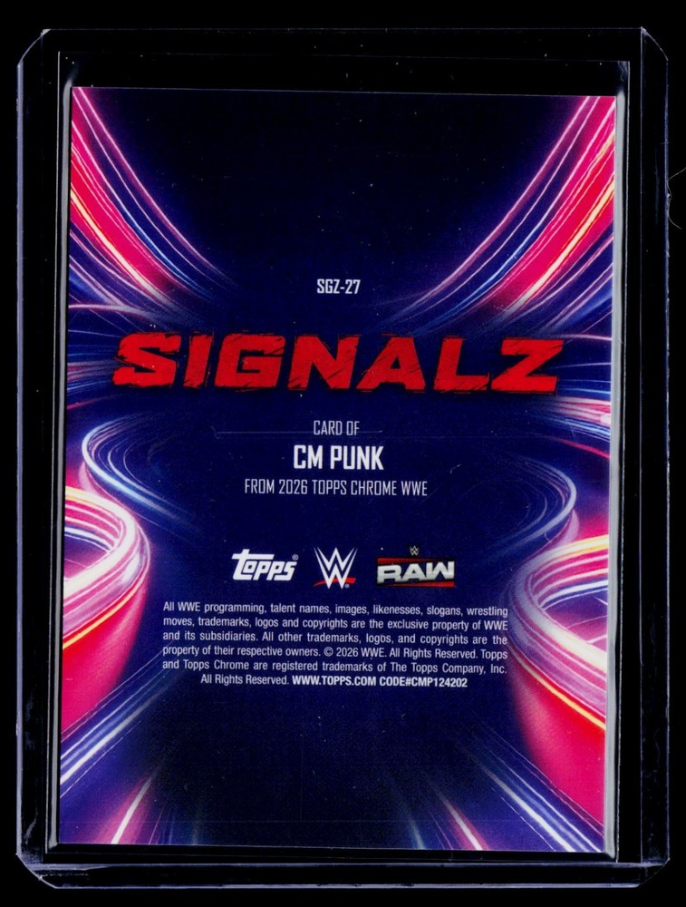 The product is a highly sought-after 2026 Topps Chrome WWE Signalz CM PUNK SSP Case Hit trading card featuring CM Punk. This sports trading card is part of the WWE league and showcases the United States team. As a collectible item, it represents a special case hit within the series, making it a valuable addition to any wrestling card collection. This card focuses on the visually appealing aspects of the wrestler, appealing to fans and collectors alike.