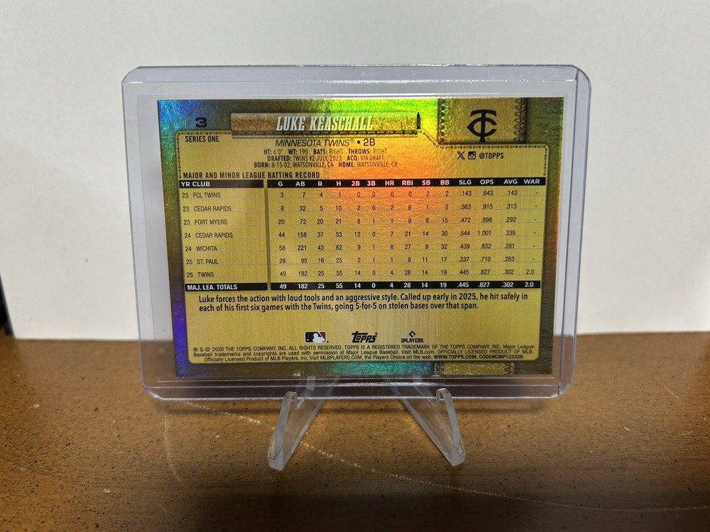 The product is a rare 2026 Topps Series 1 Luke Keaschall Golden Mirror Image Variation SSP #3 trading card featuring the player from the Minnesota Twins. This unique card is part of the Golden Mirror Image Variation insert set by Topps, manufactured in the United States. The card is made of 20 Pt. card stock and is an original piece not a reprint. It is a short print parallel variety card in near mint or better condition, making it a highly sought after collectible for baseball fans and card collectors alike.