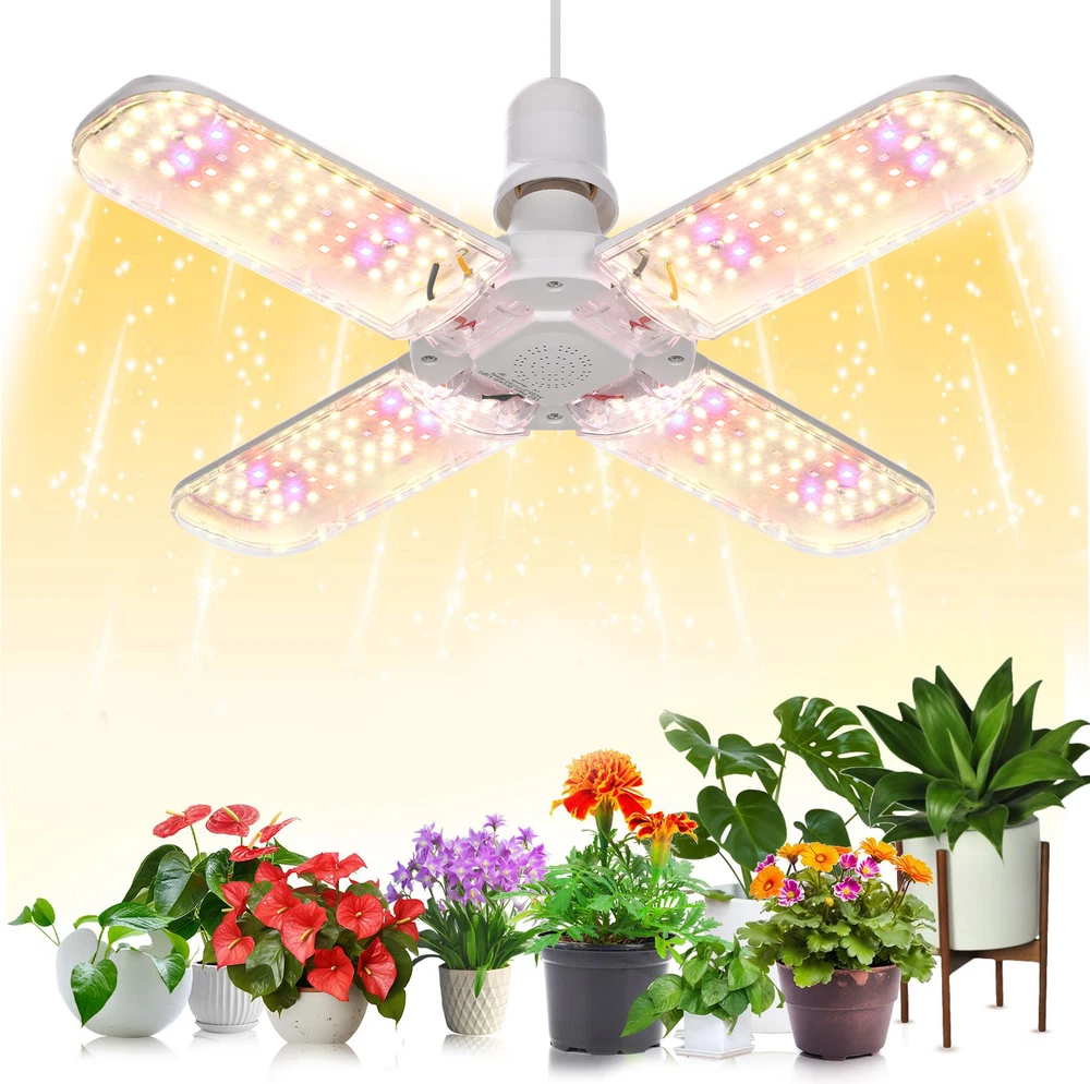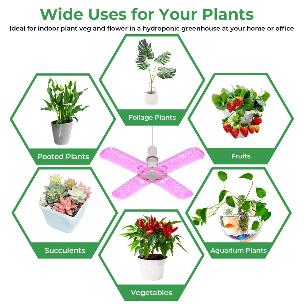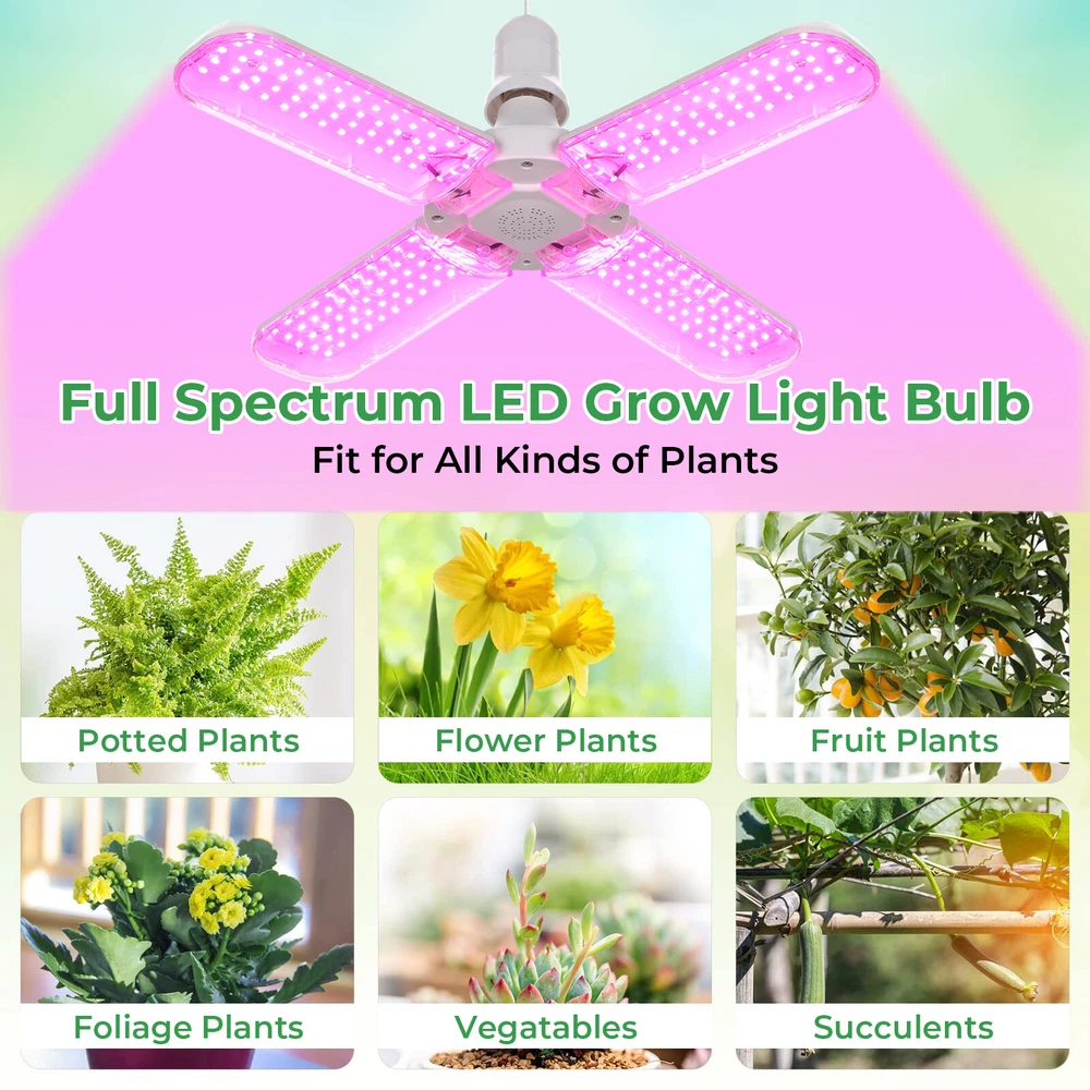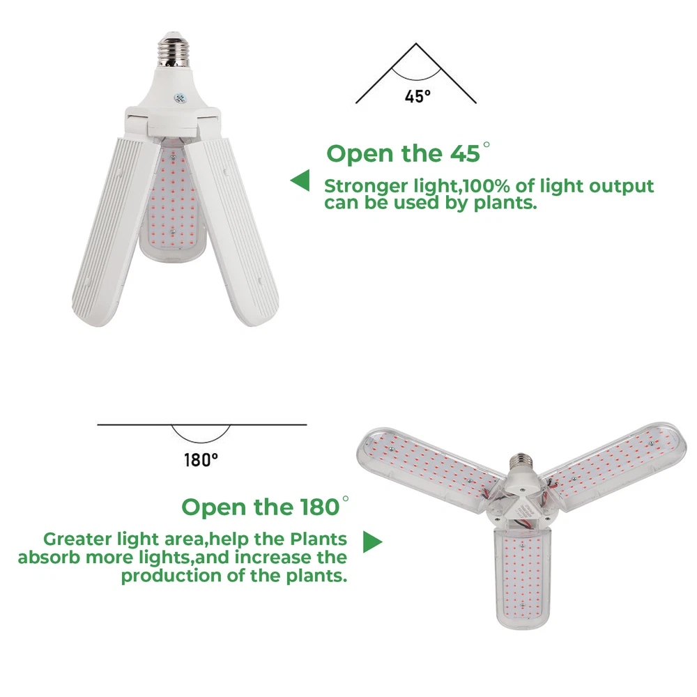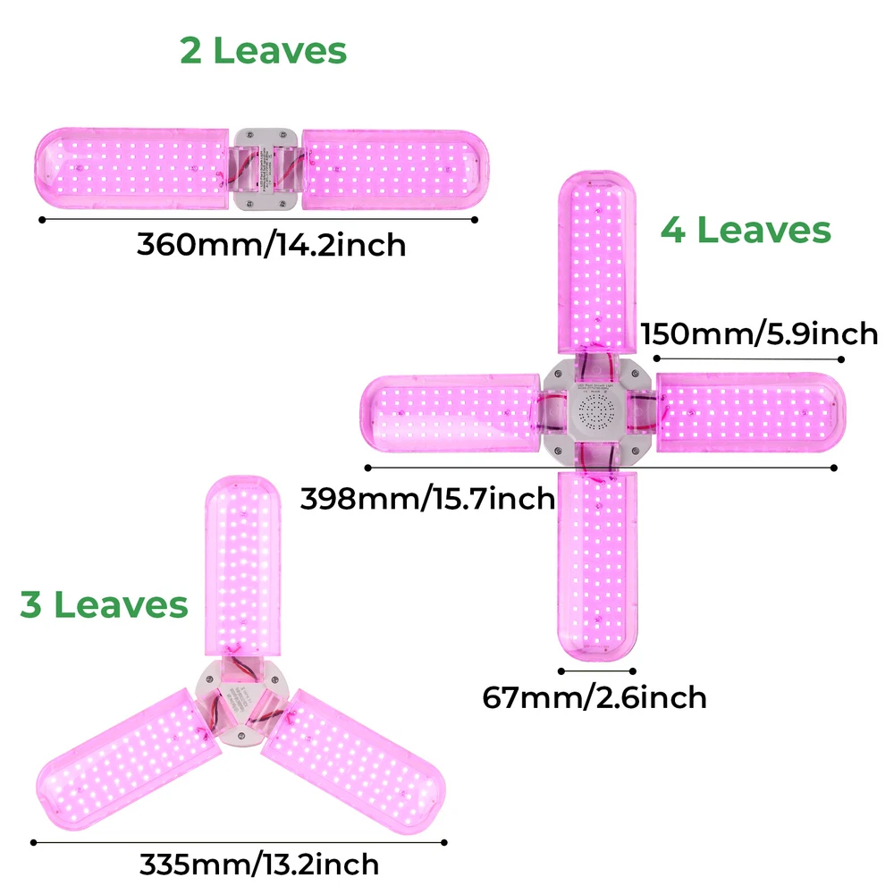 Product Description LED Grow Lights for Indoor Plants 20/40/60W Full Spectrum Plant Light Bulb, E26/E27 Lamp Holder,2/3/ 4 Leaves Foldable Design, LED Growing Lamp for Seeds, Vegetable, Flower Description: Features: 【New Technology 】Grow light bulbs use fan blades with foldable design. Each blade can be folded up to 90°, so you can decide the light direction and adjust the range of the lighting; and all LEDs are covered by the waterproof PC light cover with a transmittance of more than 100%, which can prevent water mist from touching the lamp beads, thus improving the life and safety of the plant grow light. 【Perfect Plant Grow Light Bulb】Equipped with 120/180/240pcs lamp beads and higher wattage, allowing your plants to receive more energy without burning your plants, the best full spectrum to give your plants much light with a high output PPFD distance from indoor plants. Provide the perfect high-quality sunlight for vegetables, tomatoes, cucumbers, peppers, and herbs. 【A Best Full Specturm】Full spectrum led grow light uses 380-780nm wavelength, perfect for all growing stages plants. Indoor plants receive a more uniform light than single red or blue spectrum light, making your plant grow faster and healthier。 【B Best Full Specturm】Full spectrum led grow light including 3000 K, 5000 K, 660 nm, 730 nm IR, and 395 nm UV, these light rays can simulate natural sunlight, improving the photosynthesis rate and growth speed of plants, and are suitable for all stages of plants from germination to growth to flowering. In addition, UV light can improve the immunity of the plants, so that your plants can grow healthier 【Easy To Install & Safe】It has an E26 / E27 medium base, so indoor grow lights can fit in most standard lamps. Perfect fit for your greenhouse. Flowlamp plant grow lights use Aluminium & Plastic materials to build the cooling system. Support the light working for a longer time. 【Energy Saving】This growing lights feature advanced LED technology that uses energy and generates low heat, resulting in cost savings over comparable fixtures. Our indoor plant lights are rated to last for over 50,000 hours. Specifications: Material: Aluminum+PC Full spectrum pink light LED Quantity: 120/180/240 pcs (60pcs 380-780nm of Each leaf) Sunlight LED Quantity: 120/180/240 pcs (10pcs 660nm+4pcs 460nm+2pcs 730nm+2pcs 395nm+42 pcs 3500K of Each leaf) LED Type: 2835SMD LED Power: 20W/30W/40W (Notice: LED driver power supply is affected by current and voltage, with an actual power error of ± 10%) Input Voltage: AC85-265V Base Type: E26 / E27 Package includes: 1x LED grow light Payment Shipping Returns Contact Us Paypal. We only ship to confirmed paypal address. Items are generally dispatched within 1~3 business days after payment is cleared. Please make sure your address in Paypal is matched with your shipping address before you pay. We offer a 30 days return guarantee. If you are not satisfied with the item, you can return it within 30 days after item received. If items have any problem due to quality, please contact us for refund, exchange or a replacement. Please contact us first before item returned. Customer Service from 9:00 am - 6:00 pm on Business Days. Payment Paypal. We only ship to confirmed paypal address. Shipping Items are generally dispatched within 1~3 business days after payment is cleared. Please make sure your address in Paypal is matched with your shipping address before you pay. Returns We offer a 30 days return guarantee. If you are not satisfied with the item, you can return it within 30 days after item received. If items have any problem due to quality, please contact us for refund, exchange or a replacement. Please contact us first before item returned. Contact Us Customer Service from 9:00 am - 6:00 pm on Business Days. powered by