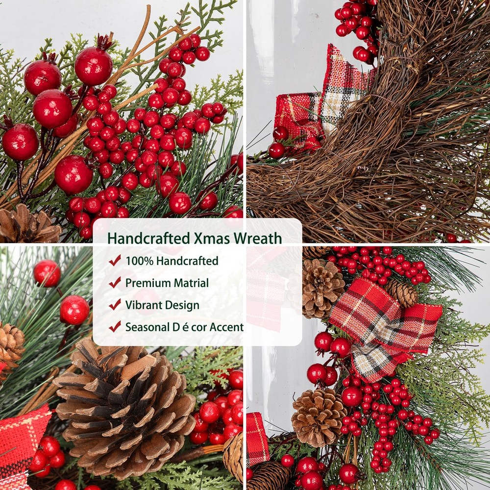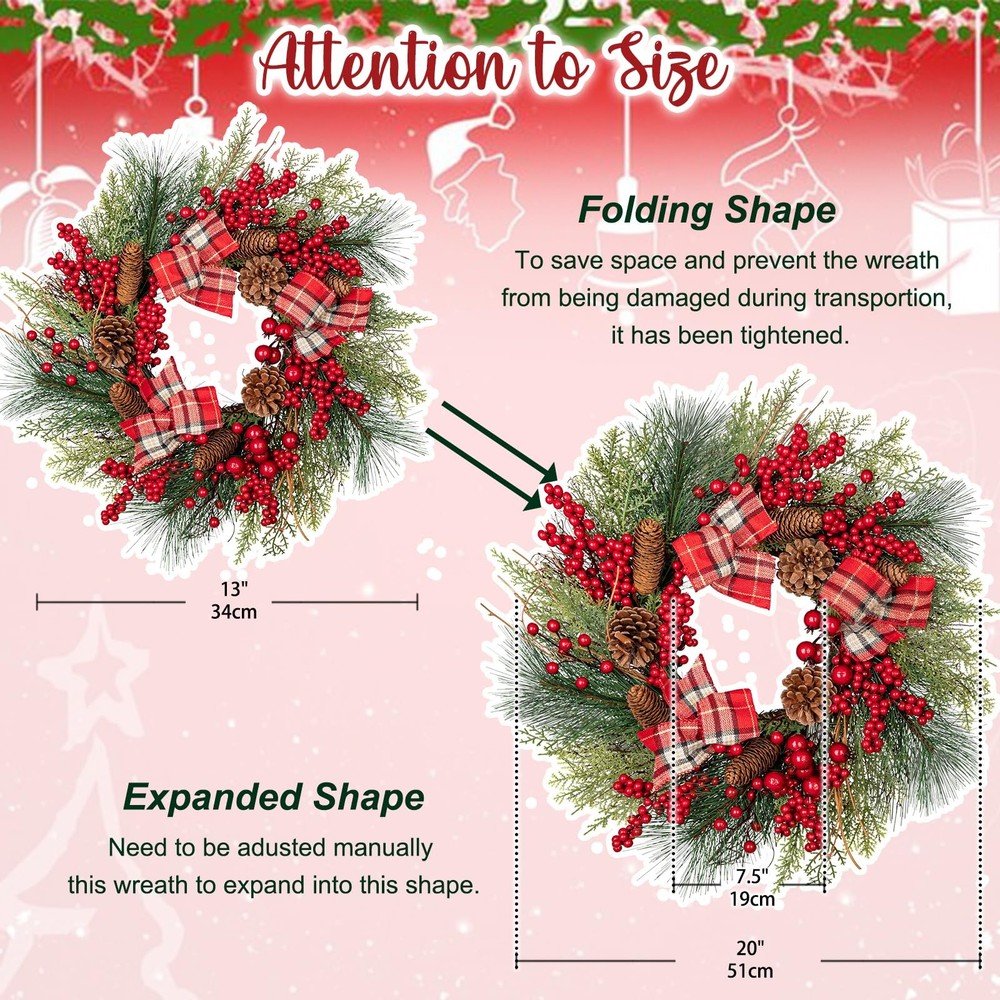 20 inch Winter Christmas Wreaths for Front Door Outside This holiday wreath features pine needles & cypress leaves branches, accented with faux red berries, and natural pinecones, it creates a striking contrast of colors with understated charm. With a bow adornments, it will makes the whole collocation simply stunning. Let's brighten up your home this season with this winter wreaths for front door!Door Whether in winter, spring or any season, this wreaths for indoors will leave a lasting impression on your guests. Just place the wreaths for front door on your living room, bedroom, patio, dinning room, entry way, balcony, corner,outdoor spaces, etc. Hanging a Christmas pine wreath on a door, wall or window in your home will bring an organic look that will catch everyone's eye and make a statement at the threshold of your abode. These green wreaths for front door are suitable for types of christmas decorations indoor & outdoor ,Christmas door decorations, Christmas outdoor decorations, Christmas centerpieces for tables, front porch Christmas decorations, Xmas porch decor, Xmas door decor, Xmas mantel decor, new year decor, ect. Note -This pine cone wreath can be hung indoors or outdoor, but must be protected from inclement weather and shielded from prolonged direct sun. This is true for most mini wreaths on the market. -You can wipe clean with a soft & dry cloth for this welcome wreaths for front door. -Please adjust the branches to your desired shape when you receive the artificial pine wreath. -Please allow 1-2cm differs due to manual measurements. The measurements are calculated from each furthest outstretched leaf dimension(It depends on how much you adjusting way). -Due to different light settings the actual color might vary a bit from the pictures. -This item is not fire retardant, please do not place near an open flame. Xmas Door Wreath - There has natural pine cones, lifelike red berries and cedar & pine needles branches, which are adorned on realistic twigs base, comes with red plaid bows, full of different layers and textures, the winter wreath is a stunning door decor that perfectly captures the essence of winter and enhance the overall winter theme, is a perfect way to welcome guests into your home this winter Premium Material - Our christmas door wreaths for front door are 100% handmade with great attention to detail and craftsmanship, comes with real dried pine cones, the pine needles & crpress branches are made of PE material, the berries are crafted from polystyrene material, and the base wreath are made from natural wood twig, this outdoor christmas wreath has a lifelike appearance and real touch, it is uneasy to deform or fade, it can be used all year round Packaging Design - We pack this small christmas wreath into a paper box and it will be tightened to save space and prevent the front door wreath from being damaged during transportion. The greenery wreath measures 13 inch in diameteris when you received a winter door wreath in folding state, and you need to adjust the leaves & twig wreath into its expanded state, you will get a 20 inch full christmas wreath indoor of enough size (the diameter is measured leaf tip to leaf tip) Indoor & Outdoor Wreath - The 20 inch wreath can be used both indoors and outdoors, its convenient design make it easy to hang it upon your door or wall easily. Its ideal size are suitable for hanging on front doors, back doors, porches, windows, staircases, walls, mantels, entry way, or in any location around the home, it offer an effortless enhancement to your home's Christmas decor Christmas Decorations - The christmas wreaths for front door are maintenance free, it can be used for several seasons and don't need to spend time to maintain. The hanging Xmas wreath will make a great addition to your home decoration, can help you keep the winter theme, it is great for decortating your living room, bedroom, dining room, kitchen, dining room, stairs, foyer, front hall, yard, garden, hotel, coffee shop, bookstore, office, etc. This christmas outdoor wreath will be brighten up your space