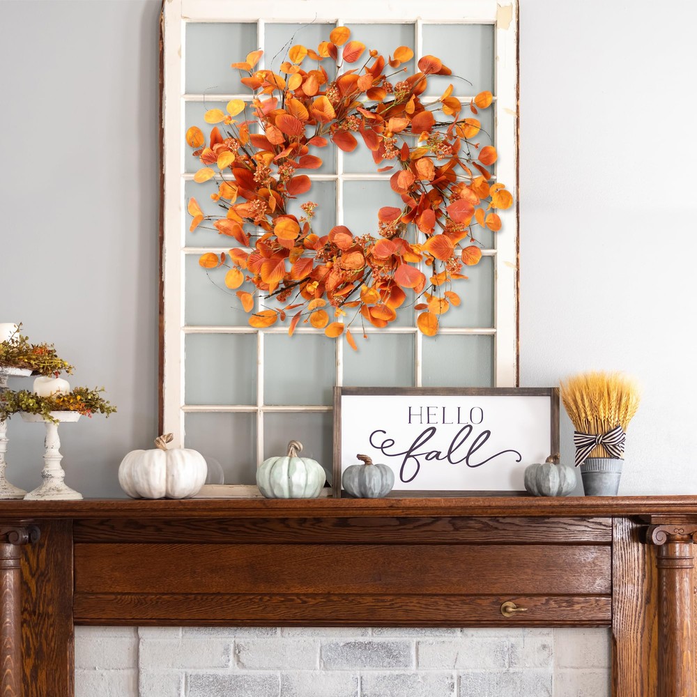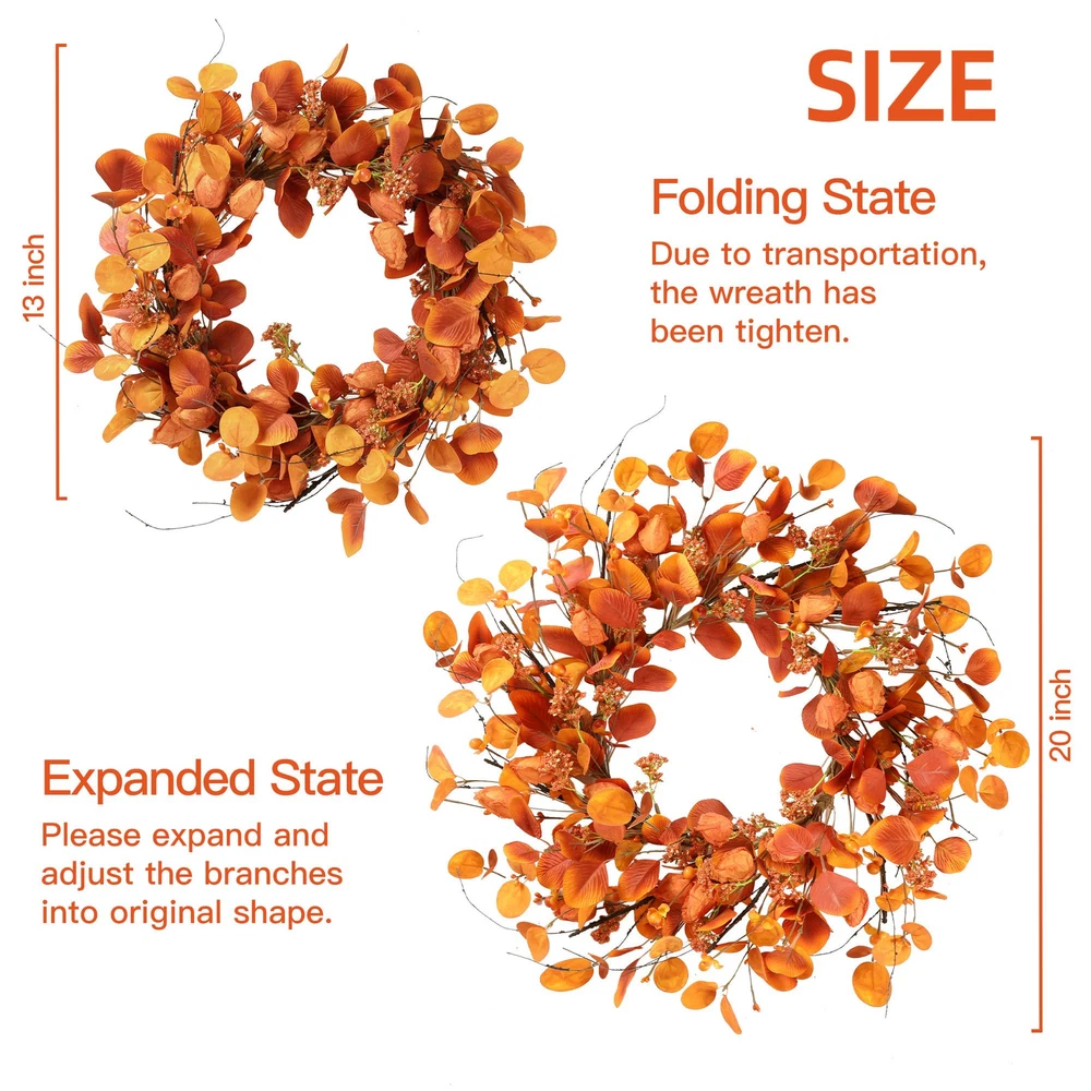 Looking for the suitable focal point to spruce up your front door or entryway for coming fall season and Thanksgiving Day? This fall wreath is a perfect and welcoming front door decor. Product specification: Materials: high quality silk Size: Outer diameter: 20’’ Color: Orange Application: front door, wall, indoors,outdoors,window,fireplace,farmhouse, living room, porch, centerpiece party, wedding, holiday and autumn, Thanksgiving, fall festival celebration, etc. Features: This artificial fall wreath has a longer compared to the real , the shape and color will stay fresh even a few years later, no need to water or sunlight. This colorful eucalyptus leaf wreath can be used as a gift for front door, wall, indoors,outdoors,window,fireplace,farmhouse, porch, wedding, holiday and autumn, Thanksgiving, fall festival celebration,etc. This handmade fall wreath has special design, made of silk, and foam with purely manual process. The appearance of the wreath is very natural, just like the real . Package Included: 1×Fall wreath in a box 1×Double sided sticky hook [HIGH QUALITY WREATH]: This fall wreath is made of premium silk full of rich texture. The base is durable iron wire with orange silk eucalyptus,small berries and artificial cape gooseberries. The entirely realistic wreath is vivid and vibrant. [PROPER SIZE]: 20 inches after fluffing. Since the wreath is packed in a relatively small box to satisfy transportation requirement, you need to expand the branches and adjust flowers into best shape and you'll get a 20 inch full wreath of enough size. We provide you with 1 double sided sticky hook to help you hang on the door. [VERSATILE DECOR]:This autumn front door wreath is suitable for front door, wall, indoors,outdoors,window,fireplace,farmhouse, living room, porch, centerpiece party, wedding, holiday and autumn, Thanksgiving, fall festival celebration. It will provide your home a strong atmosphere, warm and elegant. [EASY CLEAN]: This Harvest wreath is convenient to clean, just wipe it with a try towel to make the wreath like brand new. The eucalyptus leaves are not easily falling apart. This wreath can be used for a long time. [NOTES]: If used outdoors, please make sure to hang it under the cover to avoid rain and snow. Please don’t hesitate to us if you have any questions, we will try our best to help you!