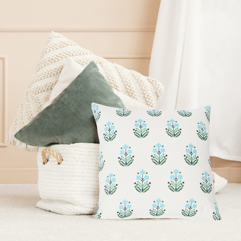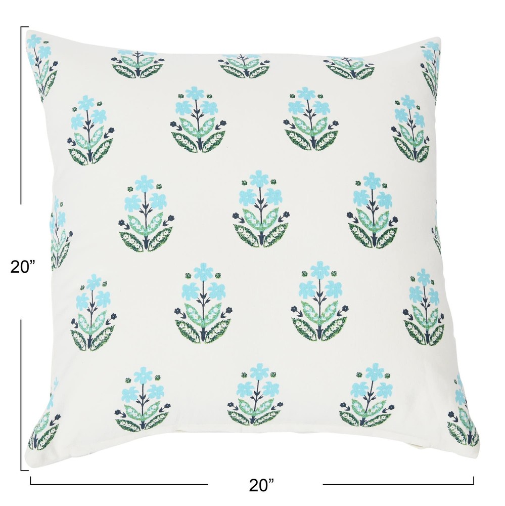Add a modern touch to your bed, chaise, or loveseat with this imaginative twist on a classic floral print; With durable construction and rich coloring, this is the ideal statement piece for any lounge space This modern twist on a classically designed pillow cover features a bold floral block print on durable woven cotton White cotton pillow cover with blue and green floral block print on front and back Express your constantly evolving style with the simple addition of this eye-catching pillow cover; Pillow cover only, insert not included Removable pillow cover; in-seam zipper closure; Machine wash warm, gentle cycle, do not bleach; Tumble dry low, warm iron if needed, or hand wash Pillow cover measures 20" L x 20" W