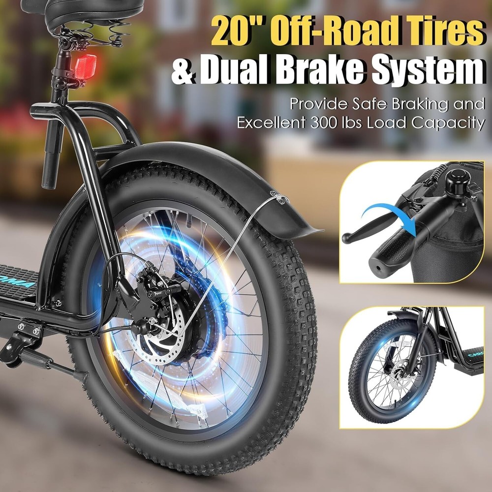 Product Description About this item 【20"X3" Fat Tire】Puncture-proof 20"*3" oversized fat tires can provide superior grip, stability and comfort on various terrains. Whether on sand, mountain roads, snowy roads or various terrains, Caroma electric scooters can bring you a comfortable riding experience. 【Upgraded Brushless Hub Motor】The upgraded 500W(Peak 819W) brushless hub motor has stronger climbing ability. In pure electric mode, it can reach speeds of up to 20MPH(32KM/H) and easily conquer slopes of up to 15 degrees. For all your riding needs. 【Long-lasting Battery Life】High-capacity lithium battery (48V/10.4Ah) certified by UL 2272, which can travel up to 30 miles (48KM) per full charge. Equipped with safe and reliable fast charging technology, it only takes 5-6 hours to fully charge, making it ideal for short trips, picnics, and shopping. 【Off-road Suspension System】The electric scooter is equipped with 2 front fork spring shock absorbers, 2 seat shock-absorbing springs and 2 puncture-resistant 20"X3" fat tires, which can effectively absorb ground impact while riding and provide better control. Combined with front and rear mechanical disc brakes and an EABS system, you can enjoy a comfortable ride and powerful braking, even on steep slopes, rough terrain, or other extreme terrain.