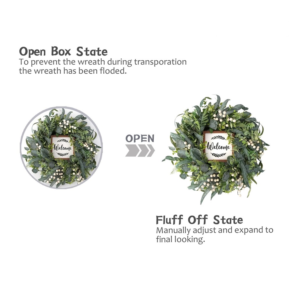 The lifelike eucalyptus wreath adds personality and warmth to your home on a front door, mirror, window, or wall, from kitchen, living room, dorm room to office, giving you and your guests a warm welcome for holidays and special occasions. Green Eucalyptus Wreath: The Spring wreath for front door contains Eucalyptus Leaves and White Berries. The eucalyptus leaves are made of silk cloth, and the white berries are made of PE material, durable and resistant to fading. Perfect size : Each wreath is packaged in a sturdy box to ensure safe transportation and storage. Upon receipt, the branches can be adjusted to enlarge the wreath to create the perfect shape. Multi-purpose : The lifelike eucalyptus wreath adds personality and warmth to your home on a front door, mirror, window, or wall, from kitchen, living room, dorm room to office, giving you and your guests a warm welcome for holidays and special occasions. Best service: It is our greatest desire and pleasure to offer you our Full Presence and Best Support. If you have any questions about our product. Please feel free to our , we will reply within 24 hours. For Every Season : Artificial Wreaths bring the season into your indoor space, vibrant color will look great for years to come! You can also add other Wreath ornaments or colorful flowers to make it unique and diversify! It is perfect decoration for any door or room of the house!